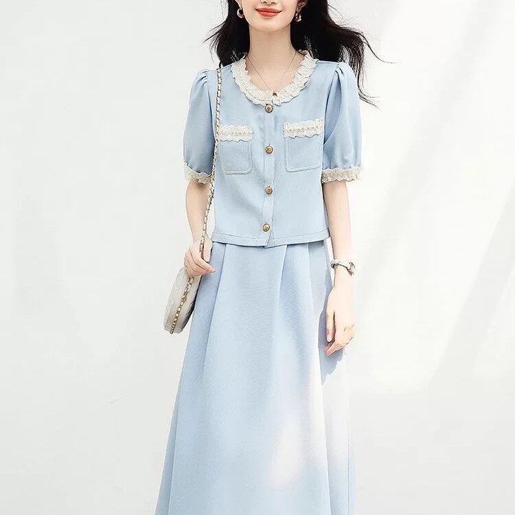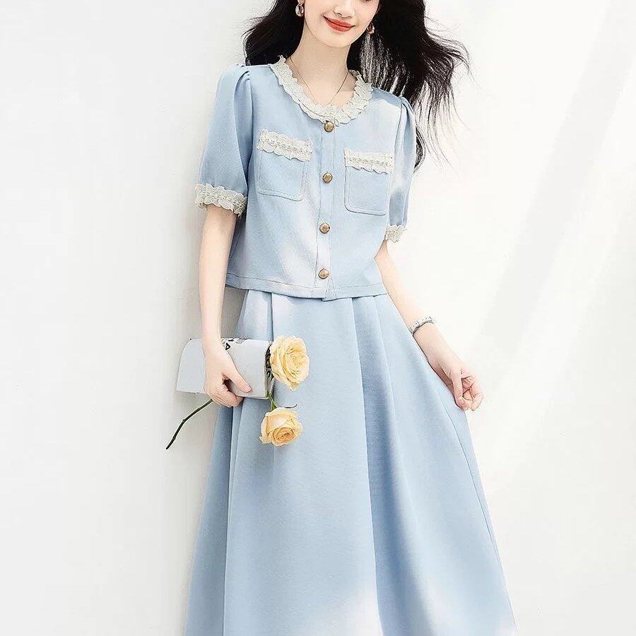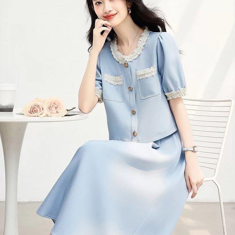 上衣半身裙两件套大码 小香风气质短袖 胖妹妹收腰减龄裙子 法式 夏装