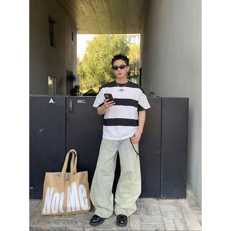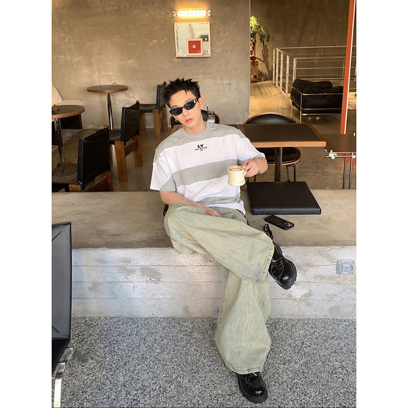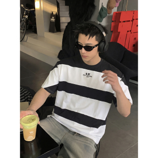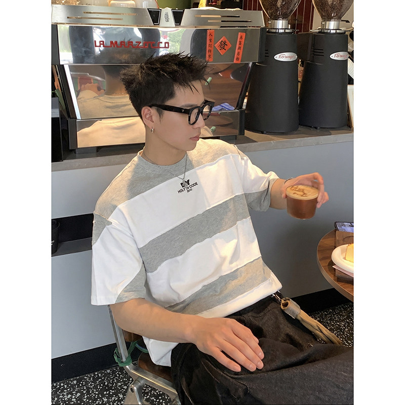 复古拼接条纹短袖 美式 T恤男女宽松设计感小众百搭上衣潮 夏季 PLTH