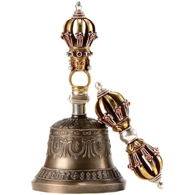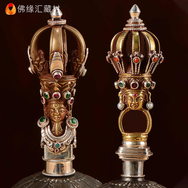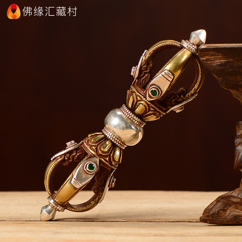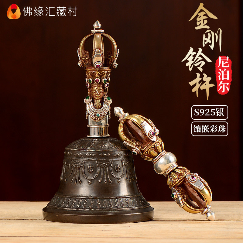 尼泊尔手工五股九股铃杵925银铜雕刻花纹N镶嵌宝石装 饰家居摆饰