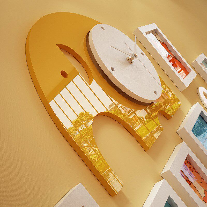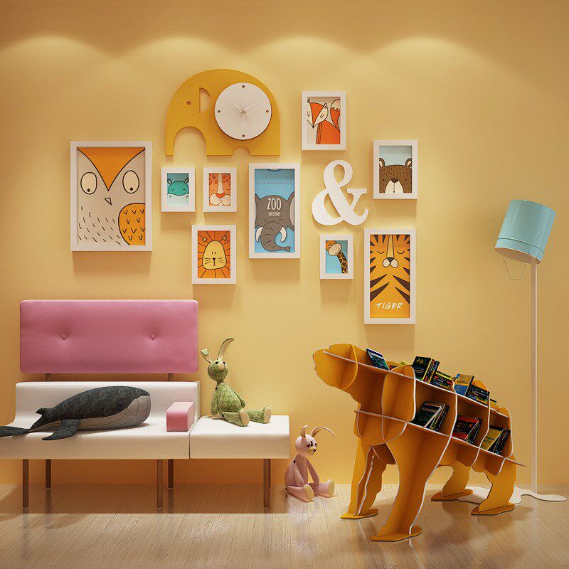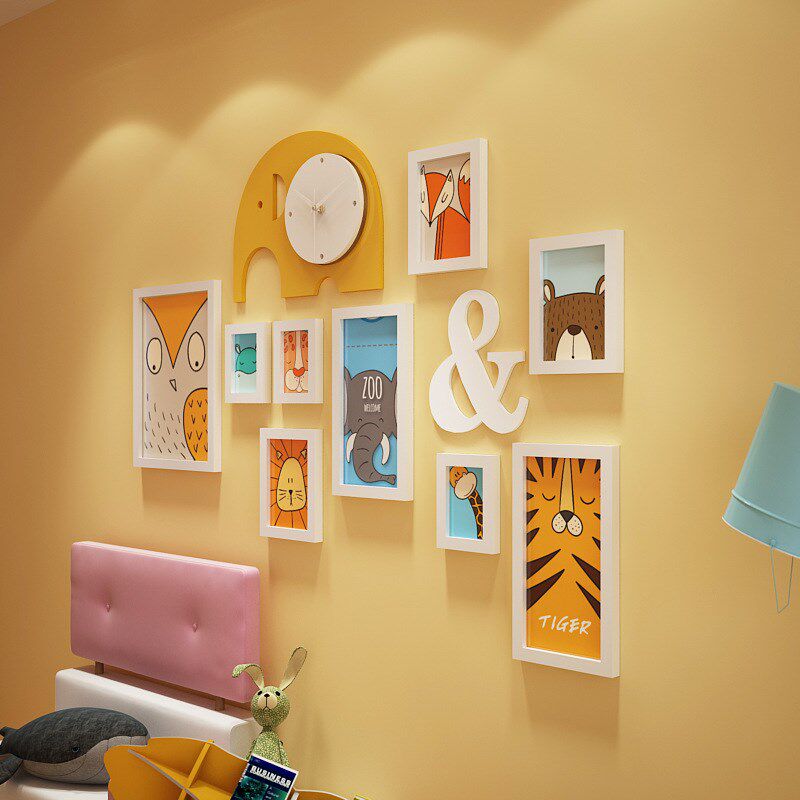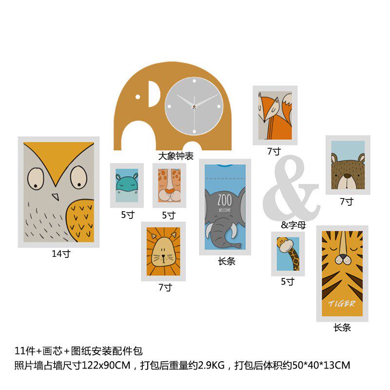 实木_6192_卡通实木照片墙儿童组合相框装 饰画大象真钟表可换相片