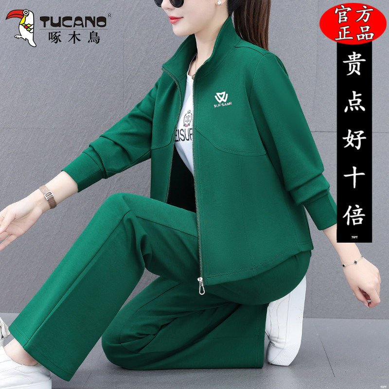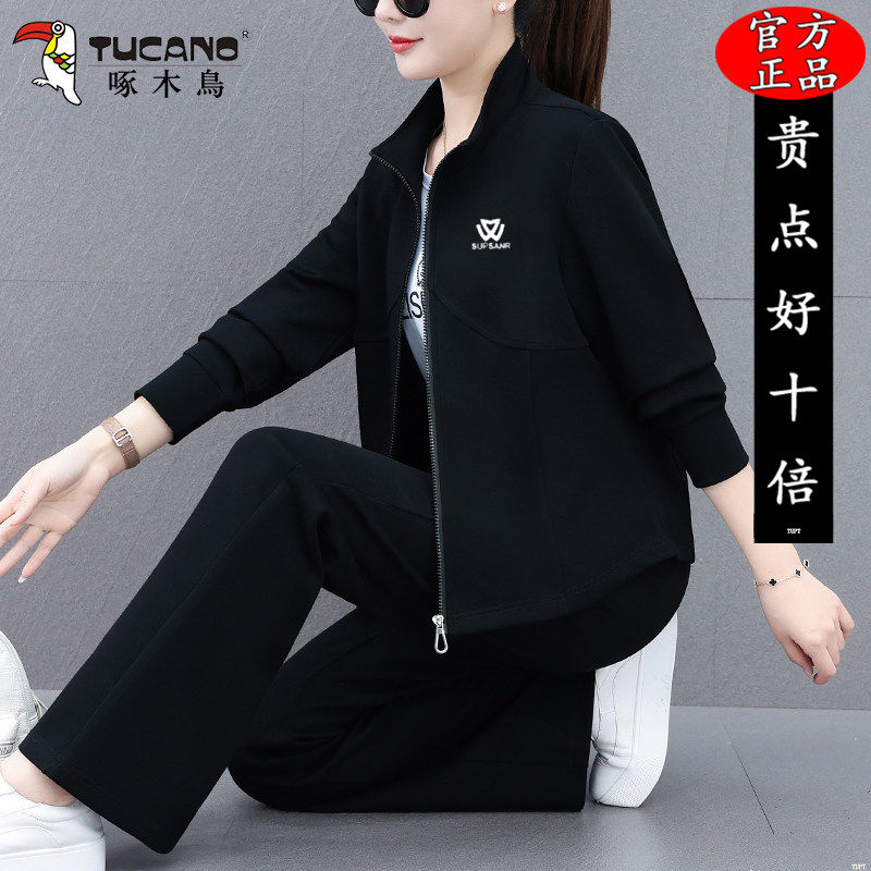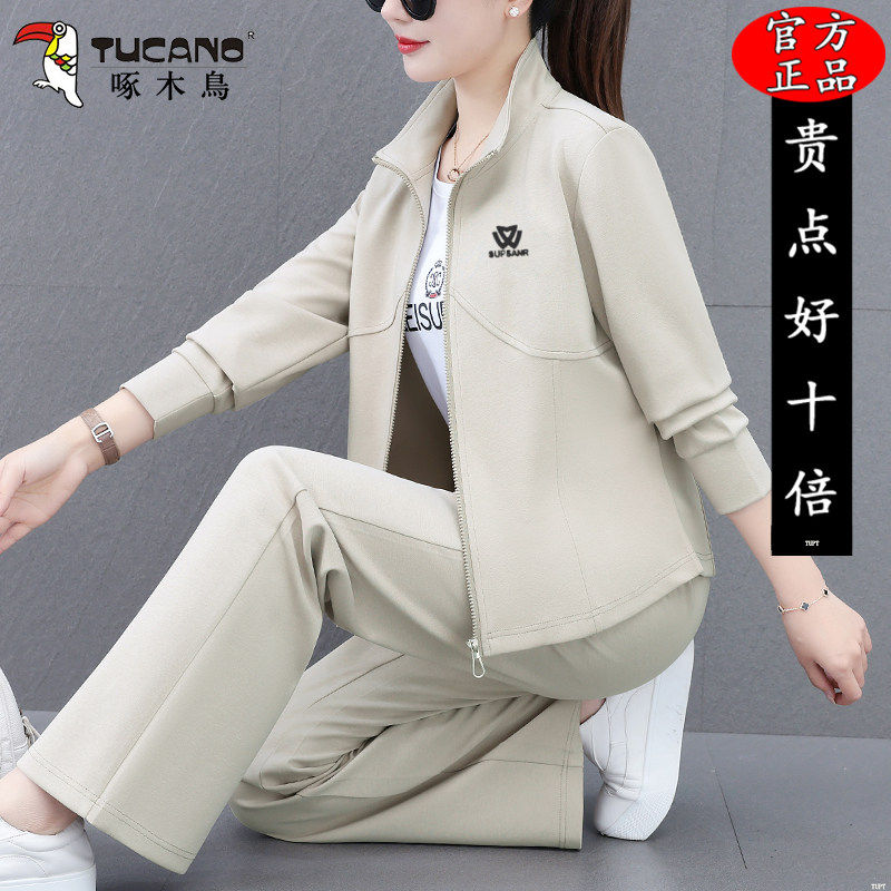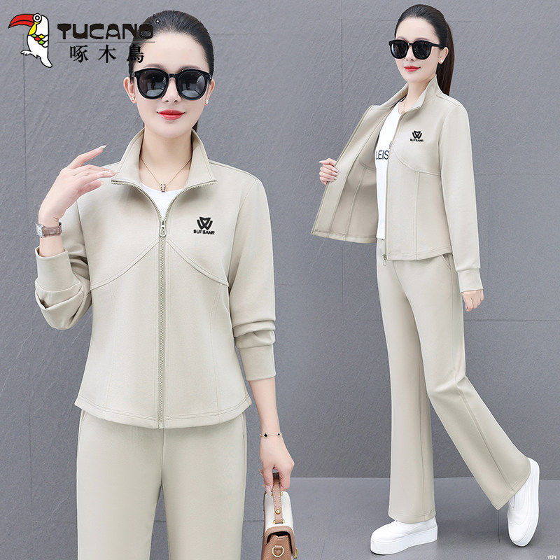 运动套装 妈妈装 女士春秋季 时尚 立领休闲三件套 2026新款 啄木鸟正品