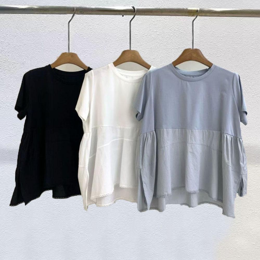 洋气开叉荷叶边下摆拼接设计短袖 T恤女宽松显瘦圆领上衣简约风格