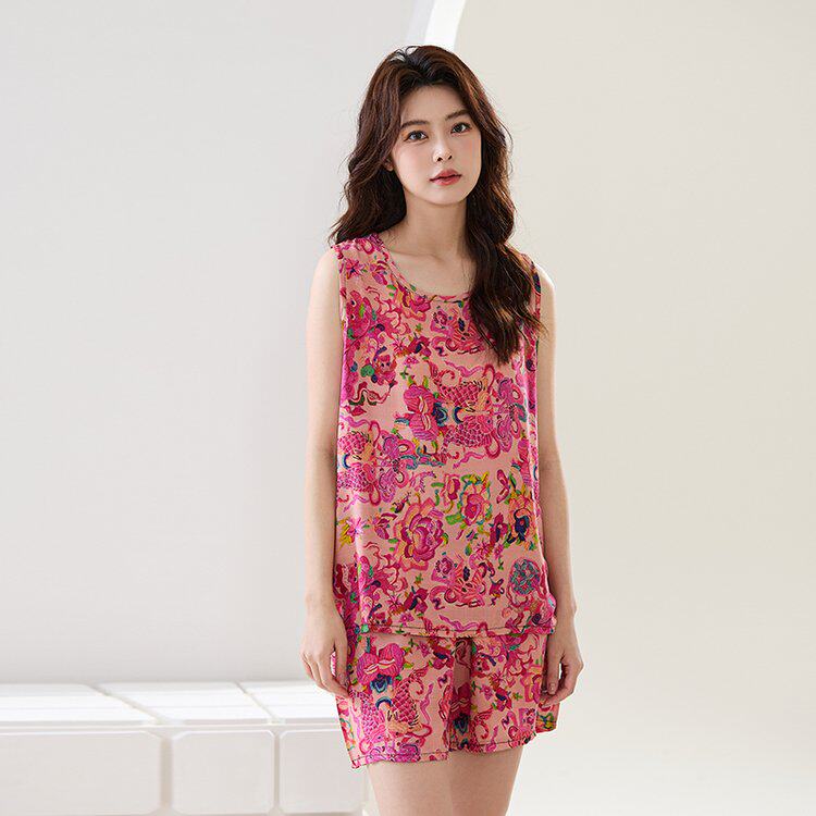 夏舒适透气 背心套装 中年睡衣碎花夏季 中老年女士家居服两件套无袖