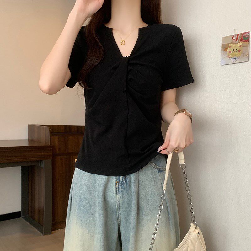 t恤女夏季 黑色v领正l肩短袖 胖mm遮肚子显瘦设计感小众短 大码 新品