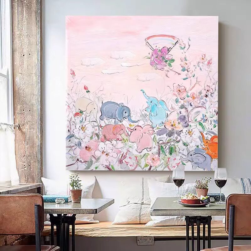 新品 饰画治愈系油画客厅吉祥大象挂 清新治愈系儿童房壁画玄x关装