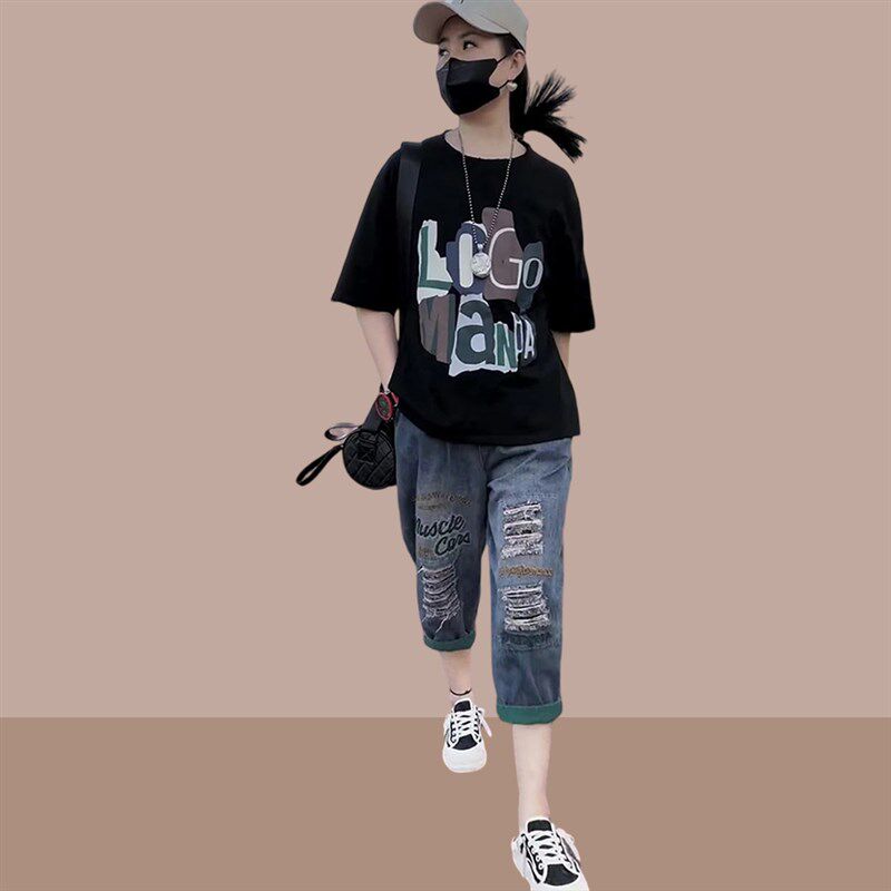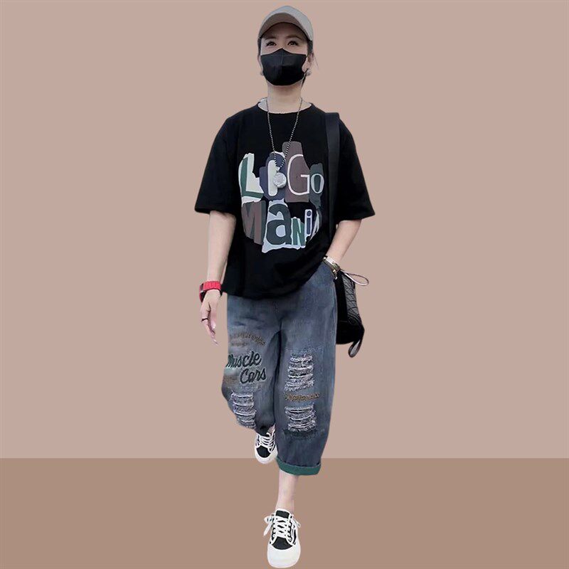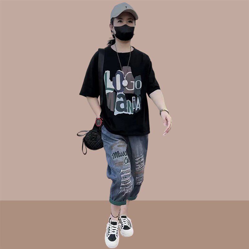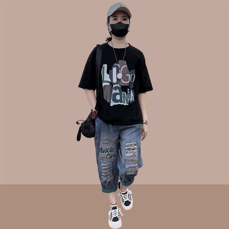 女士2024夏新款 两件套装 休闲t恤 破洞牛仔裤 时尚 女装 洋气短袖