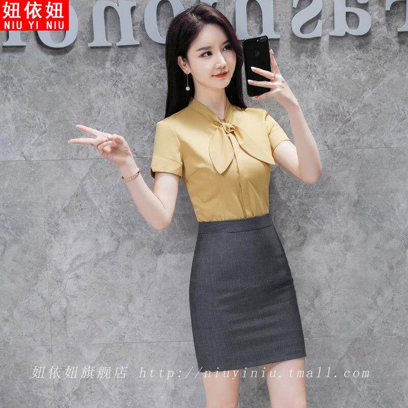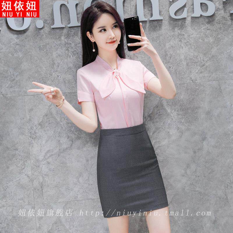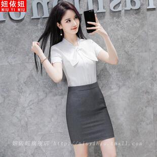 洋气网红炸街上衣OL工作服 雪纺职业衬衣蝴蝶结修身 白色衬衫 女短袖