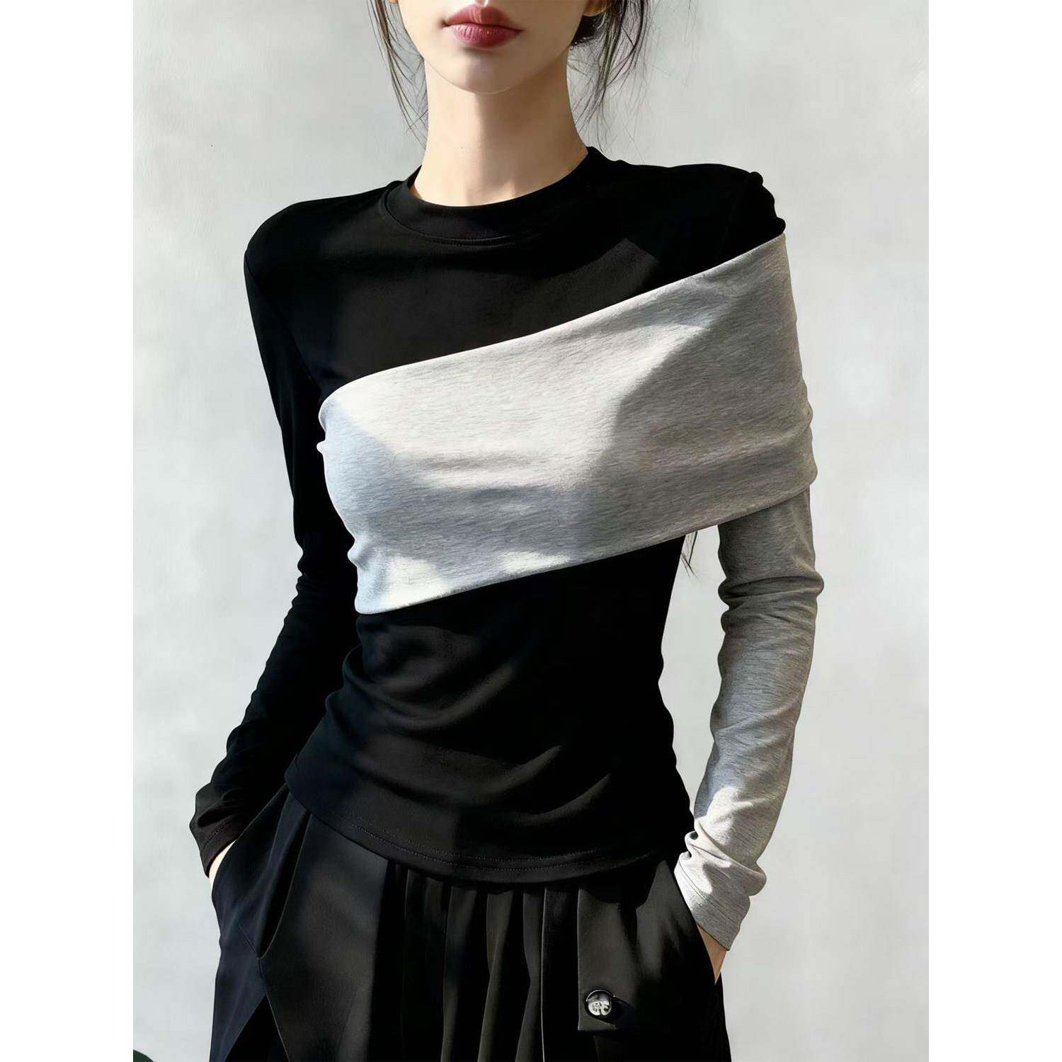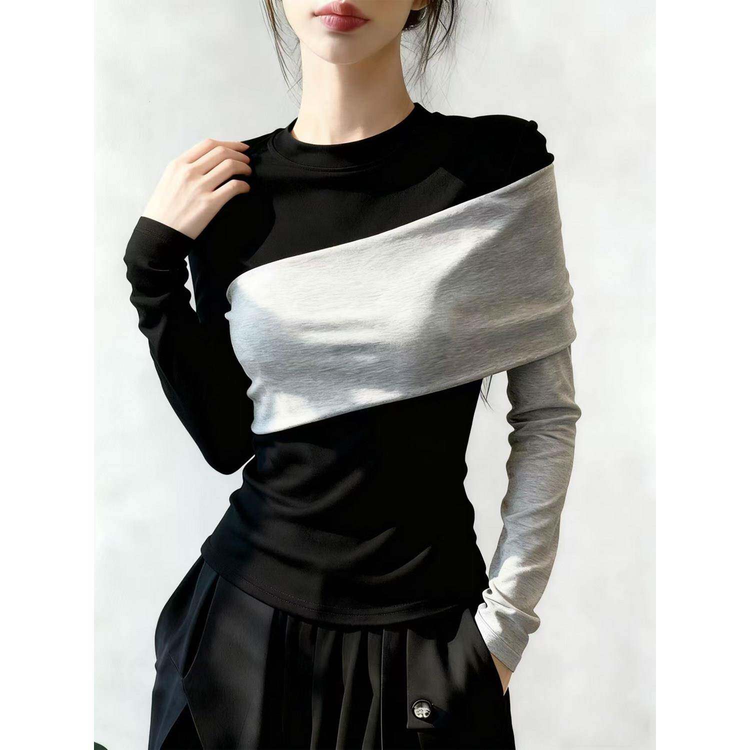 0325z 胖妹妹百搭气质显瘦打底衫 春夏不规则撞色假两件T恤女装 大码