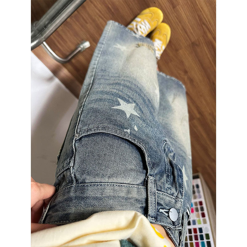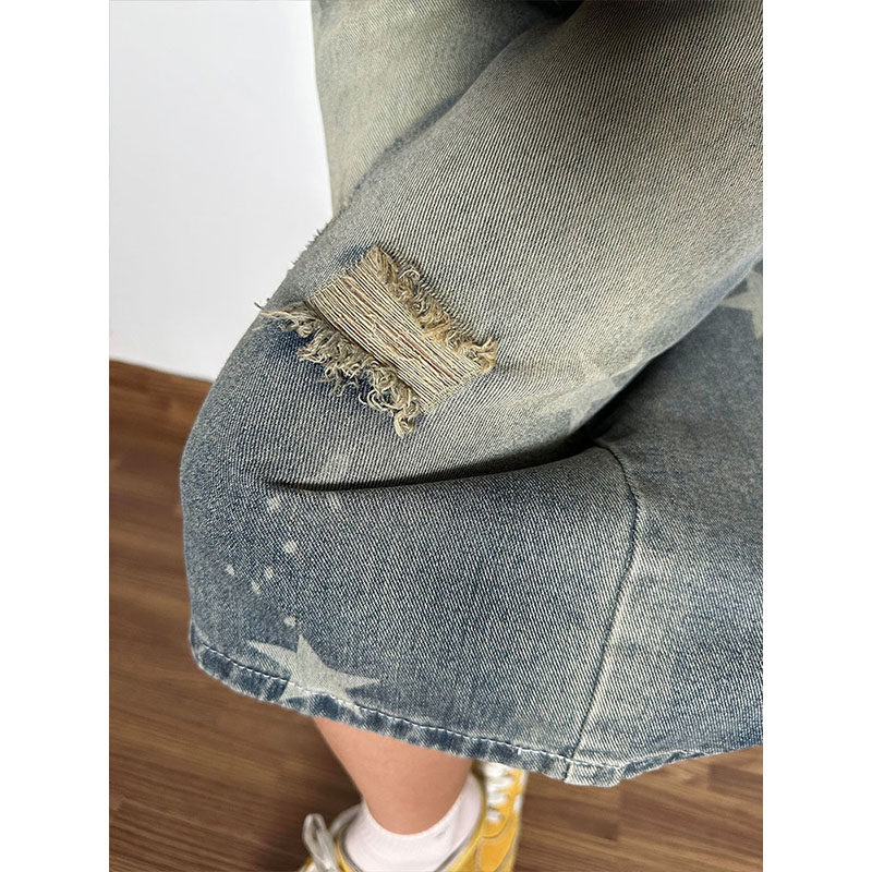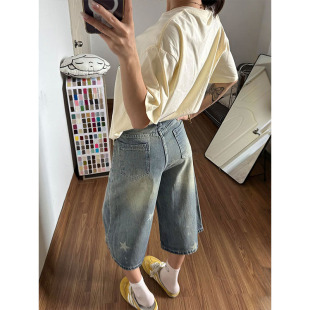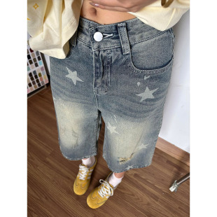 胖mm宽松显瘦梨型身材阔腿裤 破洞星星牛仔七分裤 大码 新款 子 女夏季