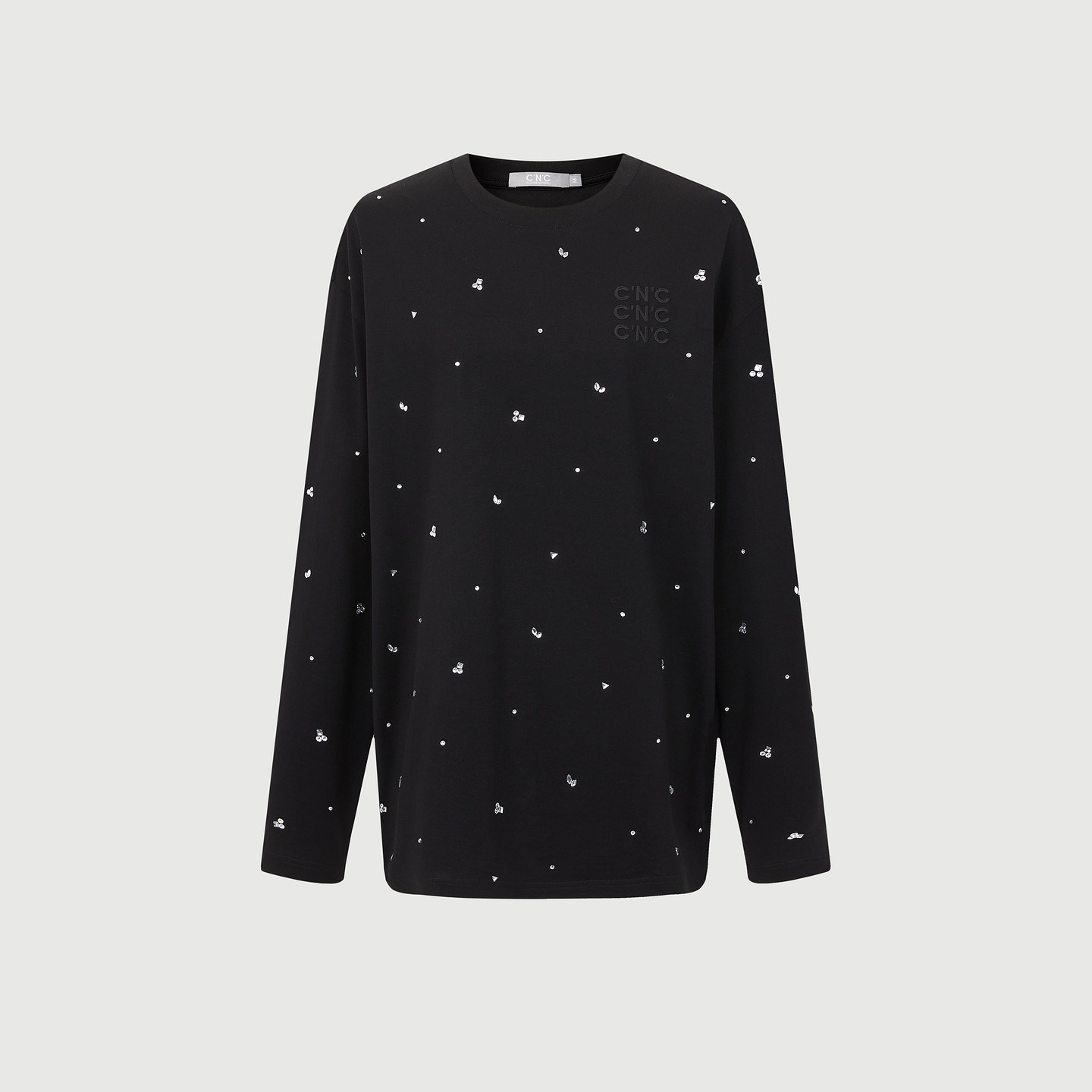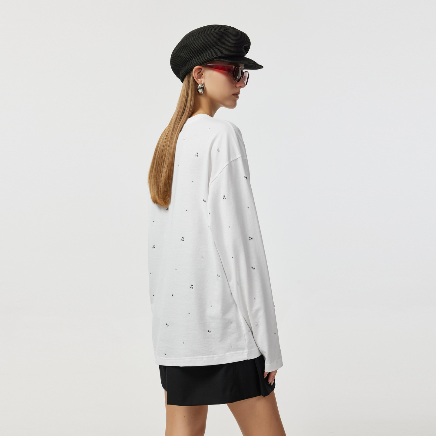 白色百搭纯棉宽松圆领长袖 2026早春新品 CNC女装 T恤女 重工烫钻
