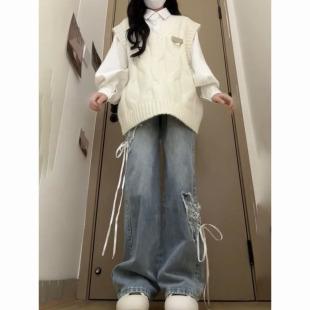 两件套装 衬衫 马甲背心毛衣搭配polo领长袖 早秋温柔学院风V领无袖