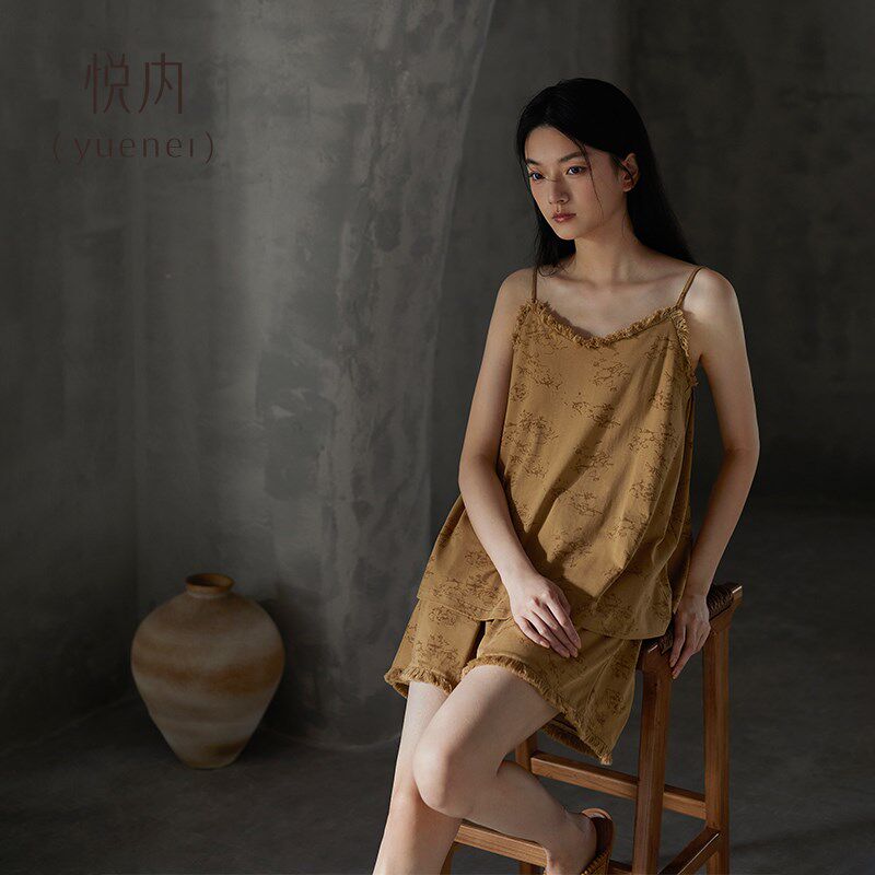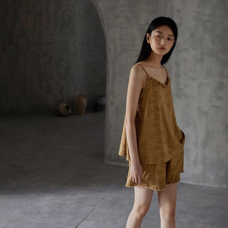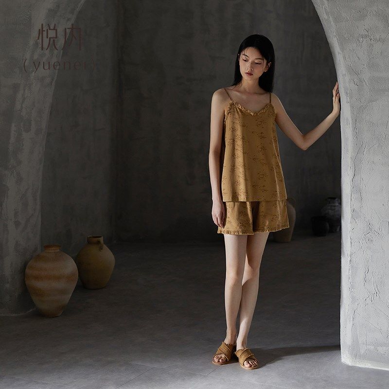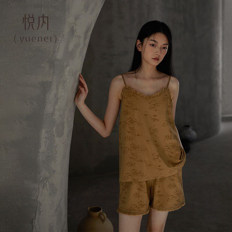 纯棉家居服两件套装 吊带背心短裤 夏款 悦内带胸垫一体睡衣女士夏季