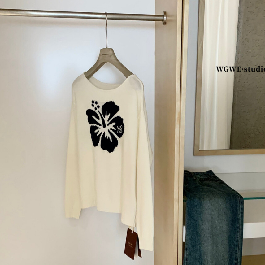 毛衣女W7757 韩系简约花卉刺绣宽松显瘦斜肩长袖 WGWE2025秋季 新款