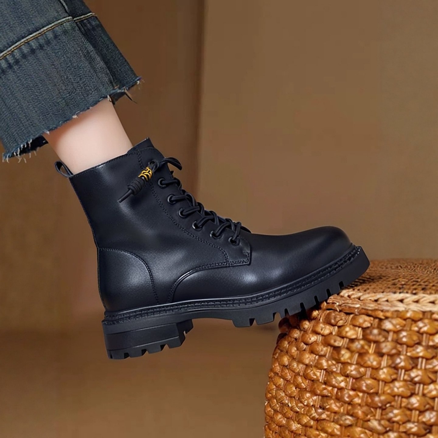 内增高马丁靴女靴子2025新款 秋冬真皮厚底大头短靴复古高帮大黄靴