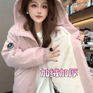 加绒加厚双拉链连帽冲锋衣外套女2026冬季 百搭小个子棉服上衣 新款