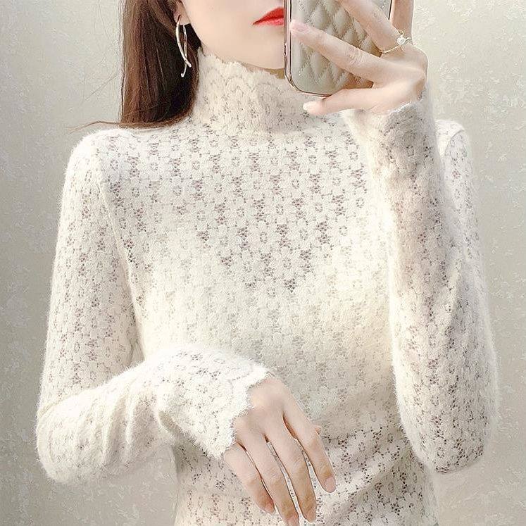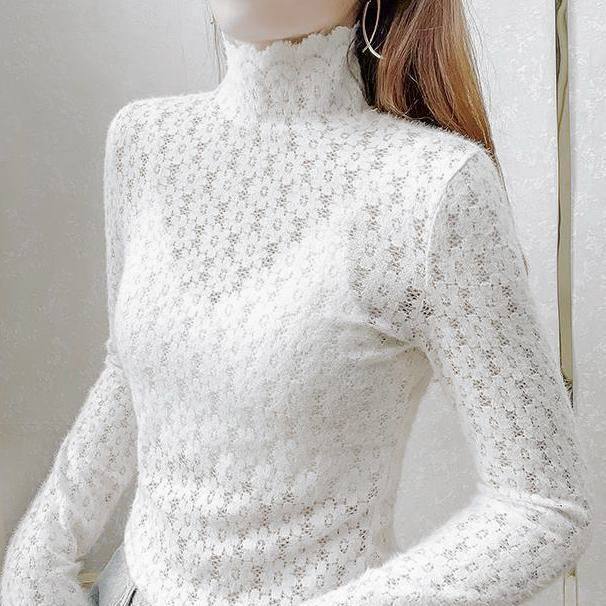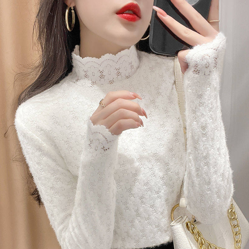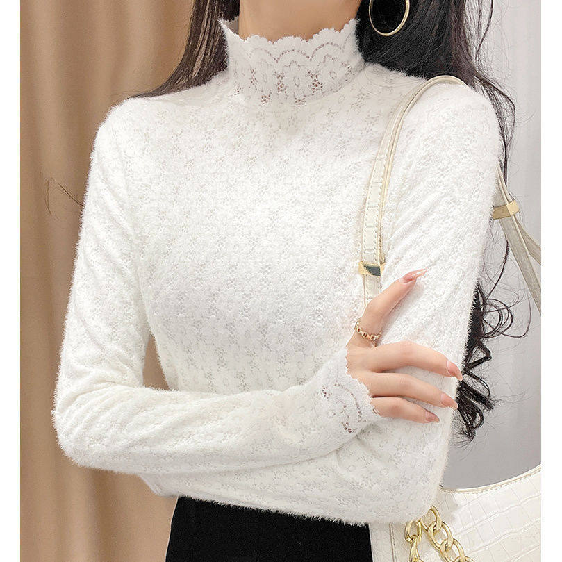 洋气百搭高领小衫 蕾丝打底衫 加绒加厚款 秋冬新款 网纱内搭上衣 女装