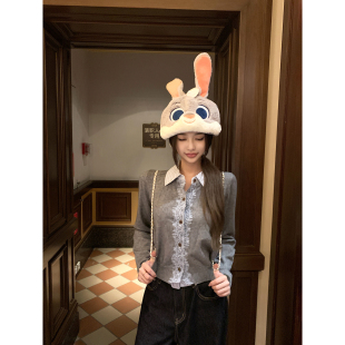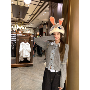 Thas9i九亿 灰色蕾丝花边拼接polo领上衣女学院风假两件针织开衫