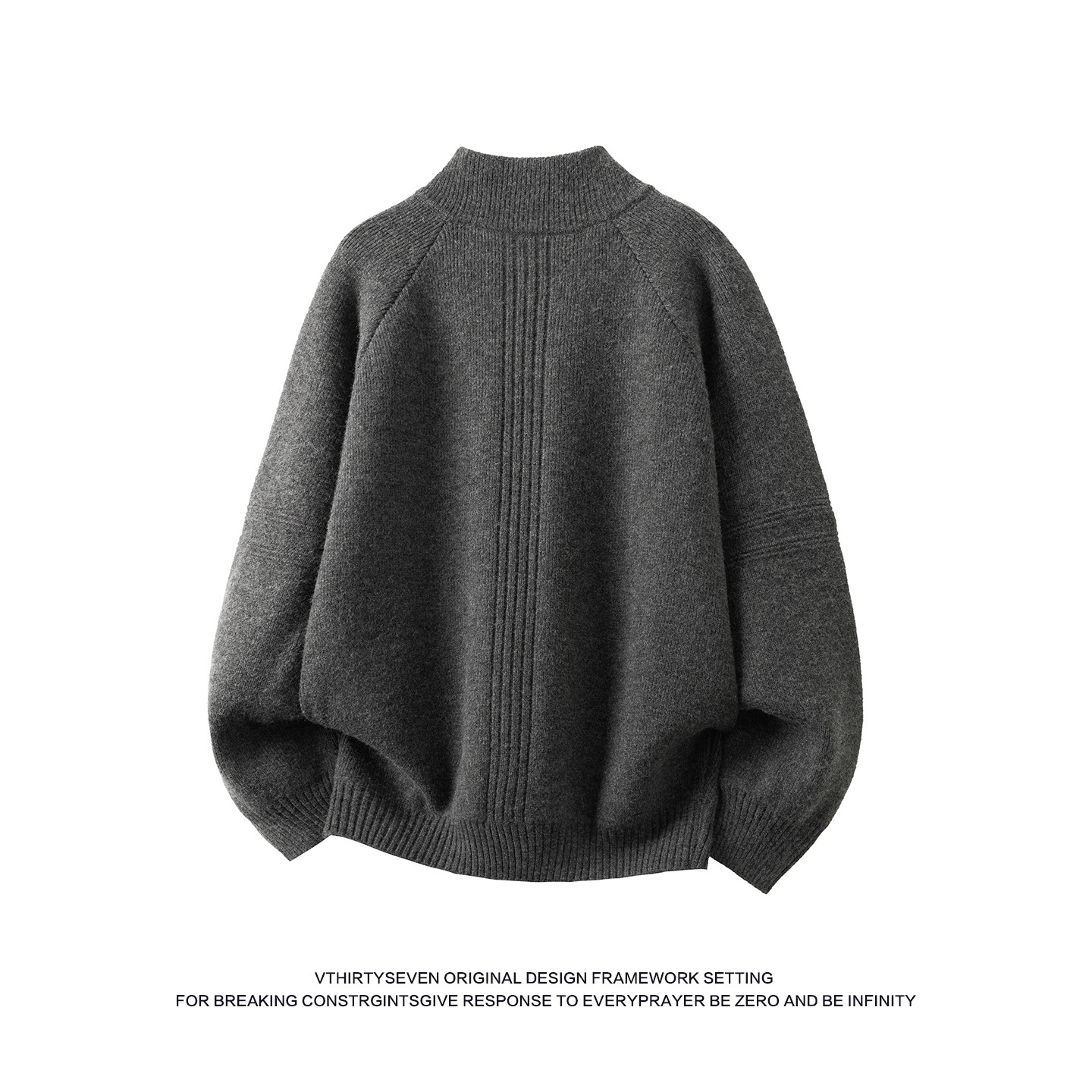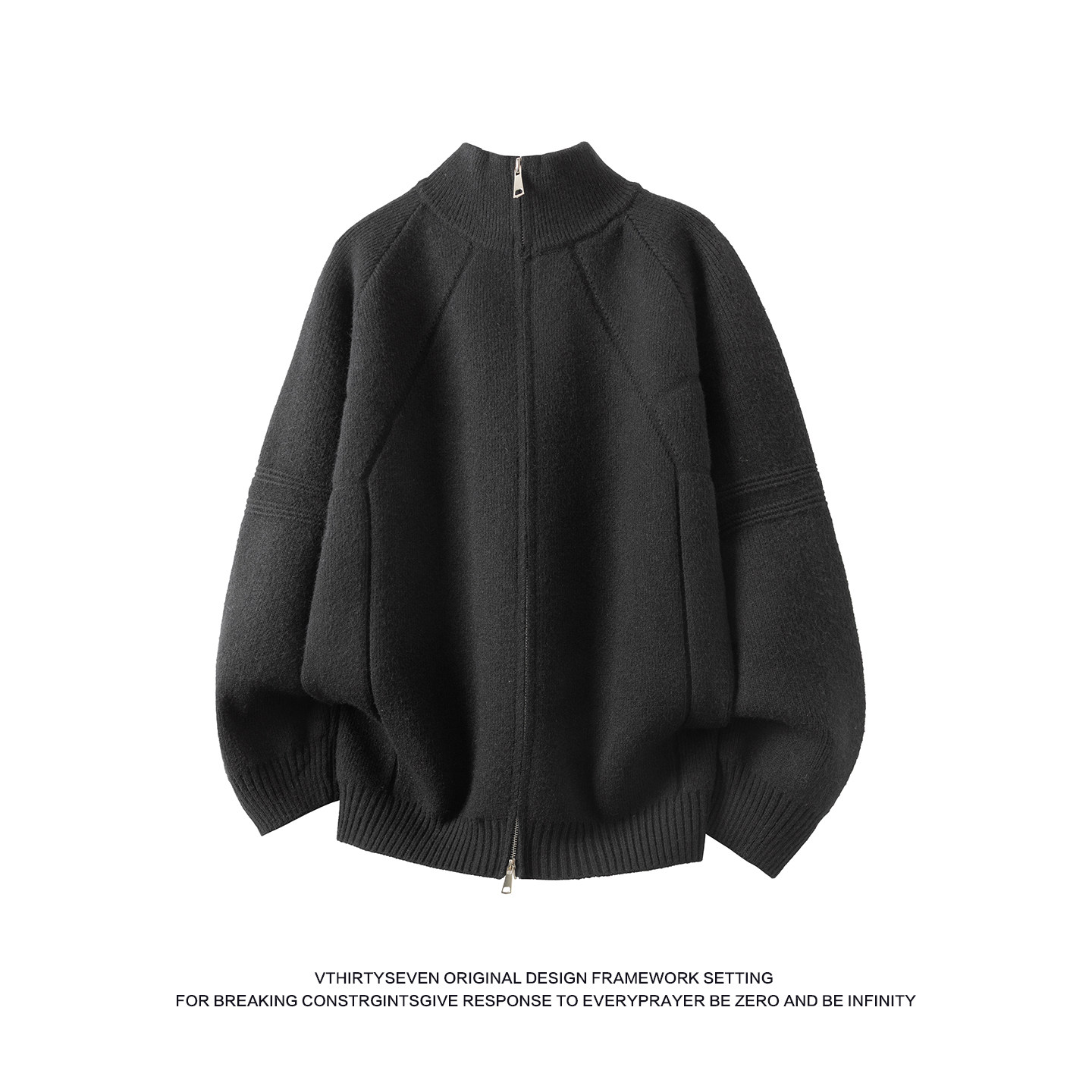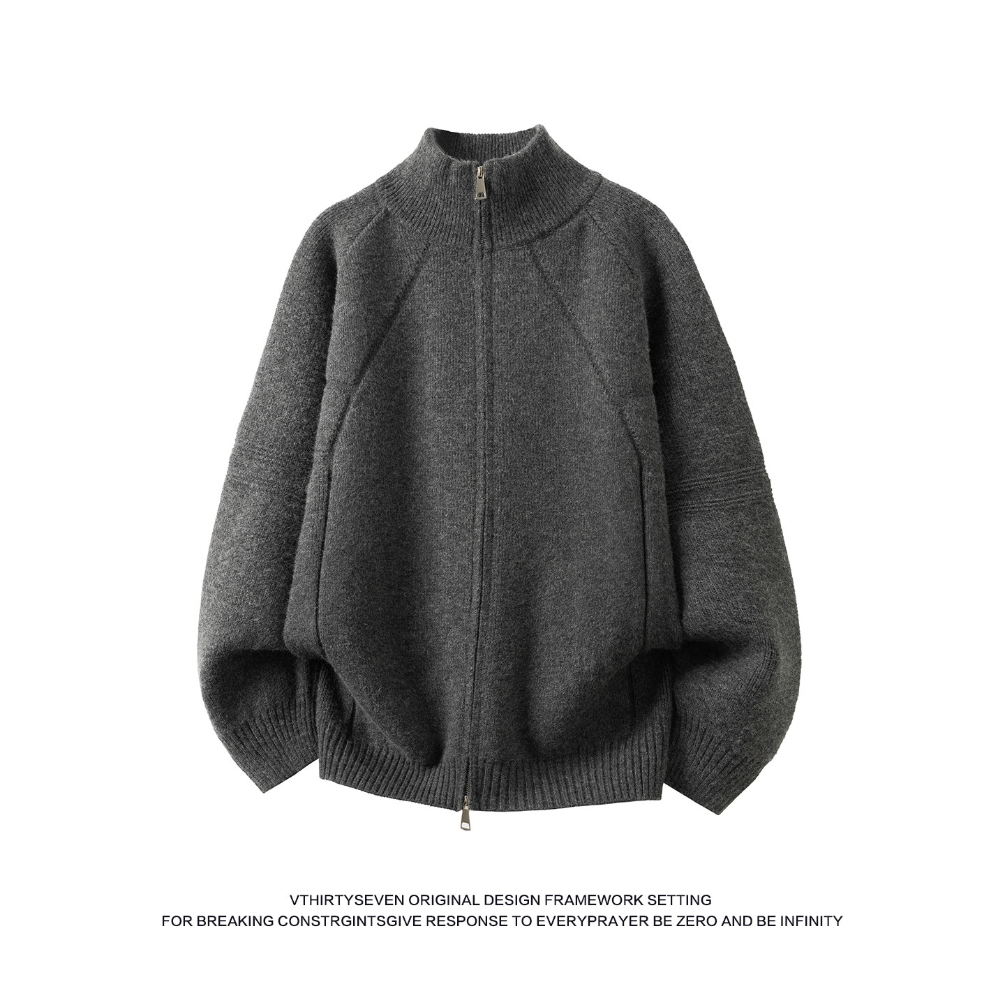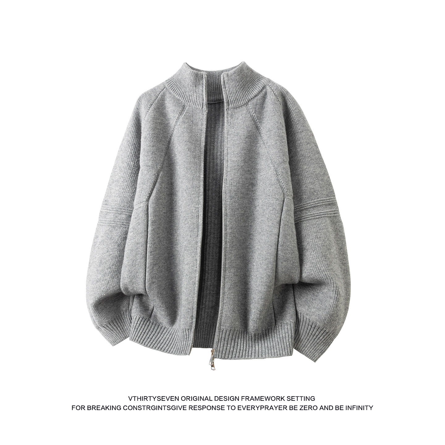 外套 毛衣男春复古宽松拼接针织衫 V37美式 浅灰色双拉链立领针开衫