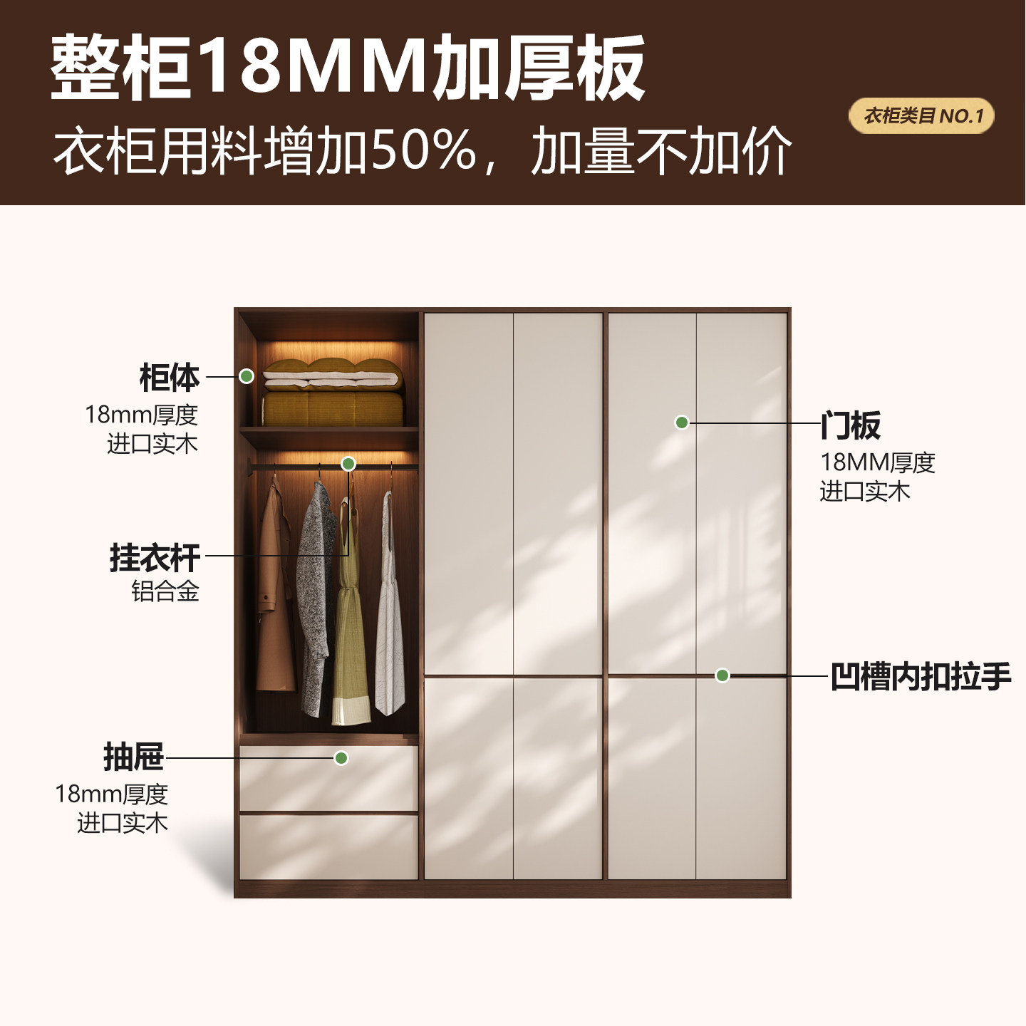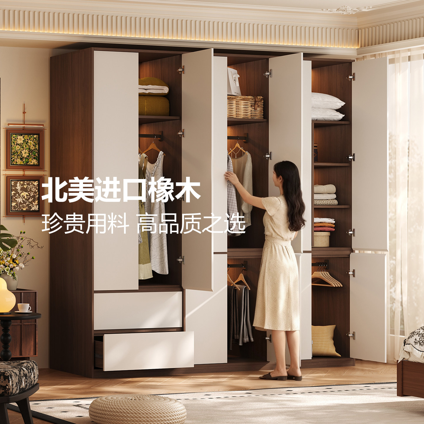 国补中古风实木橡木衣柜家用卧室定制小户型分段式 免拉手收纳衣橱