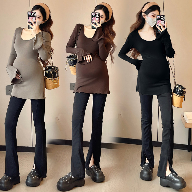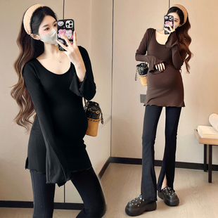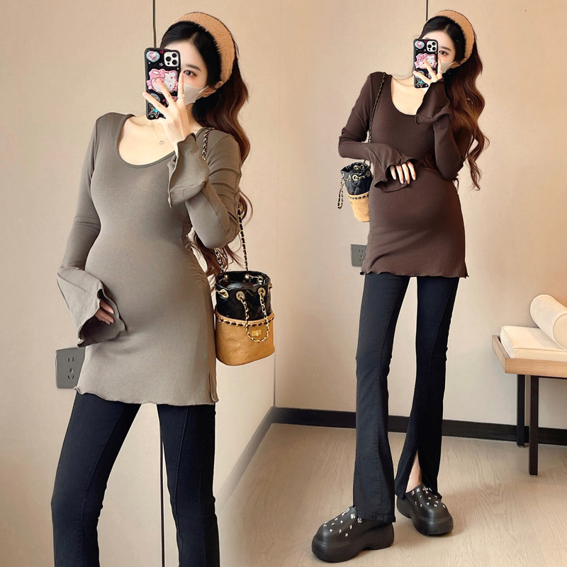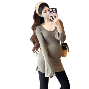 上衣女2025新款 内搭秋冬装 修身 打底衫 显瘦百搭T恤喇叭长袖 孕妇装