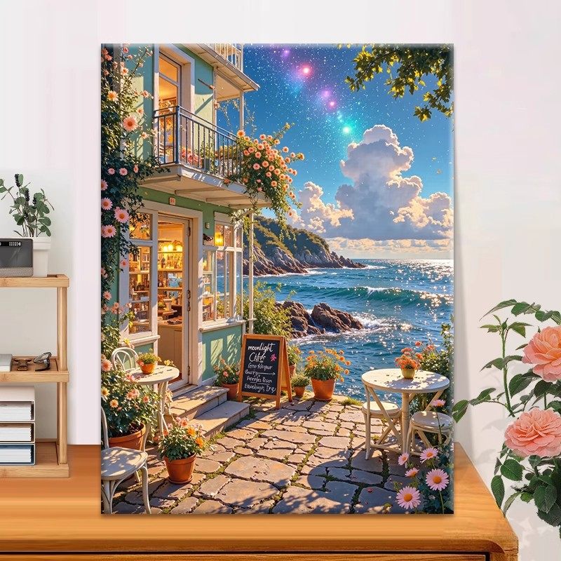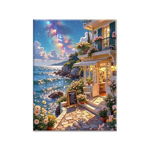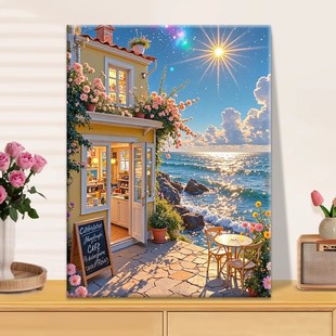 海边咖啡店装 饰画成品仿油画风景唯美治愈梦幻建筑卧室客厅摆挂画
