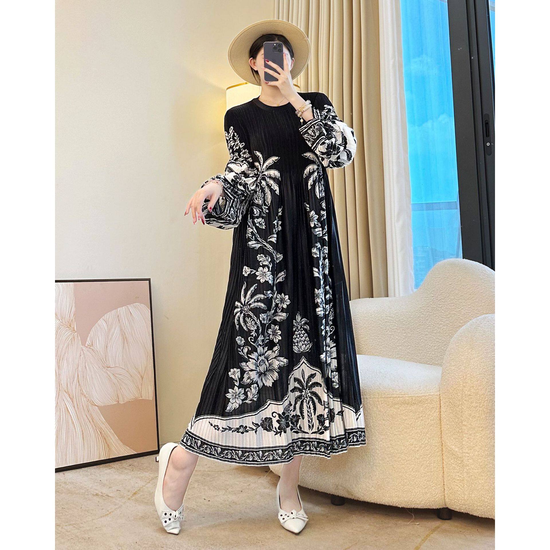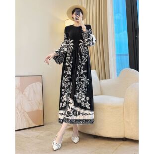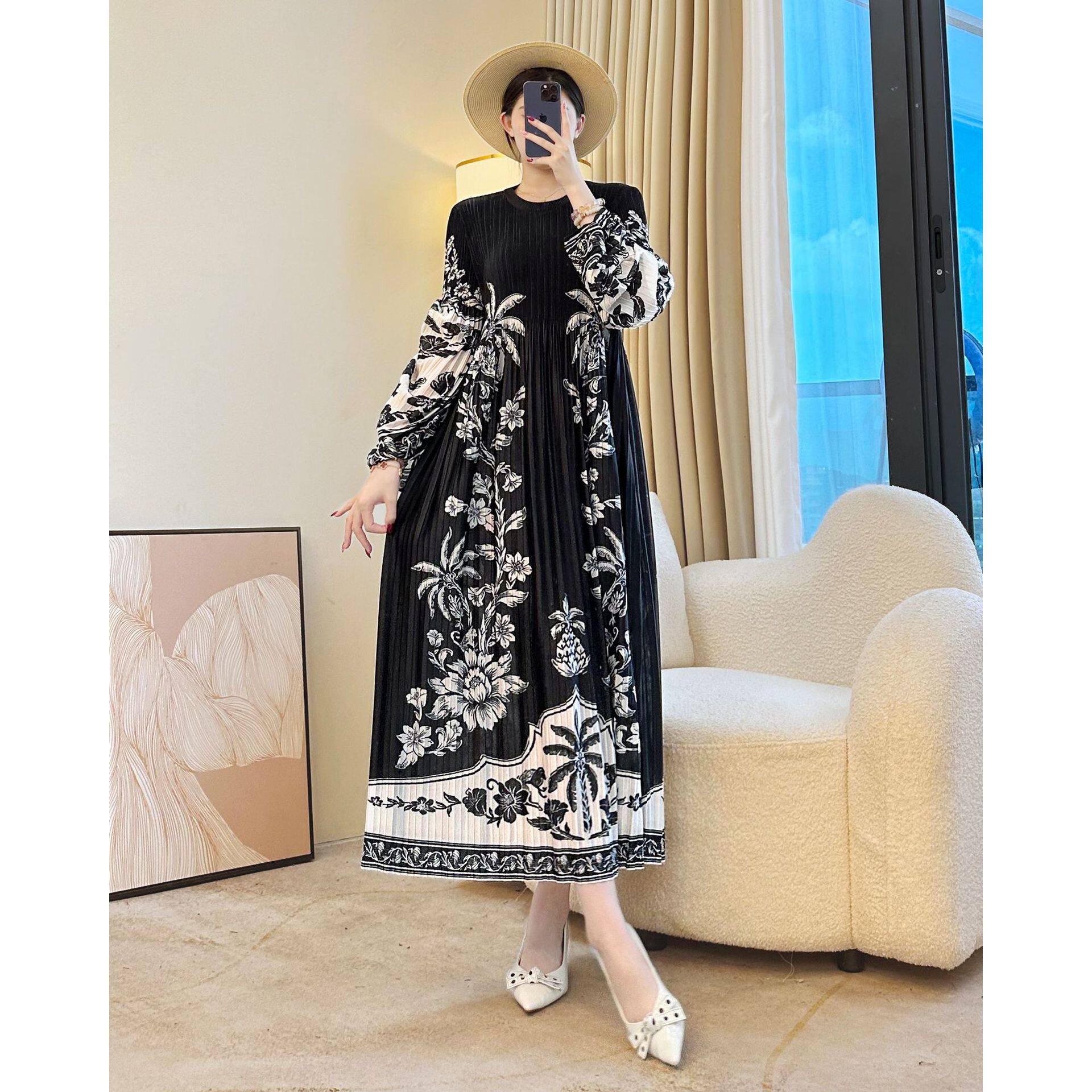 优雅复古印花褶皱连衣裙女秋冬中年妈妈装 遮肉显瘦A字长裙子 大码