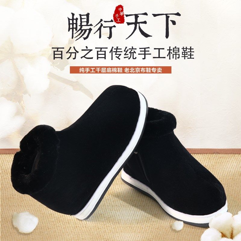 男式 手工棉鞋 千层底加绒加厚高帮靴子中老年防滑软底 冬季 女士大码