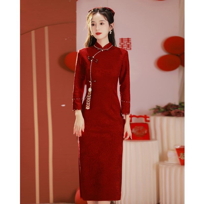 高端气质2023新款 故双栖 旗袍女复古民国年轻款 红色长袖 醉红颜