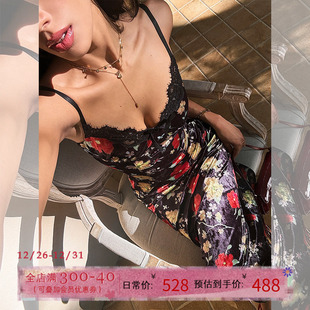 ITSNIKAR法式 黑色丝绒印花吊带连衣裙女蕾丝拼接油画裙露背长裙子