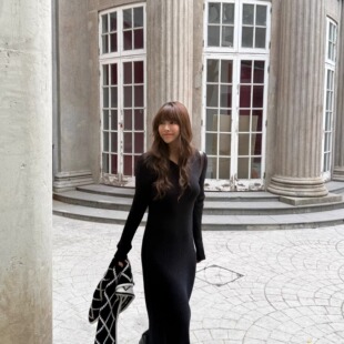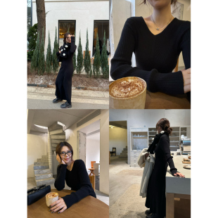 秋冬内搭打底针织连衣裙女气质黑色V领修身 包臀裙子 3ts