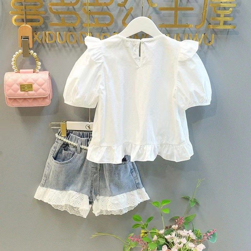 Set Blouse Lace 2025 Denim Sleeves Girls Bubble Summer with