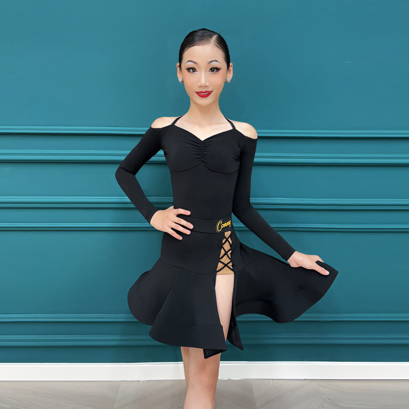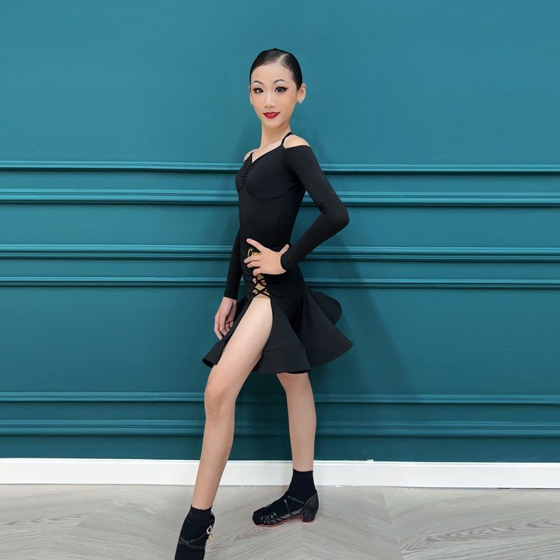 长袖 速发新款 拉丁衣服上蹈集训练功服儿童半身裙舞舞表演出套装
