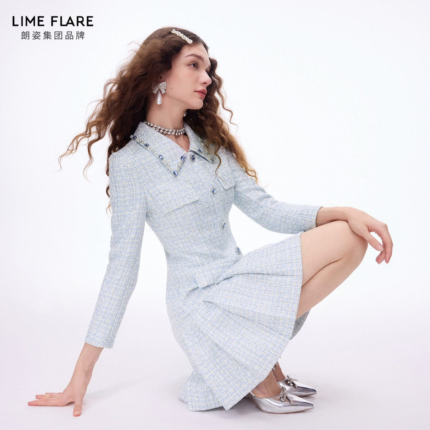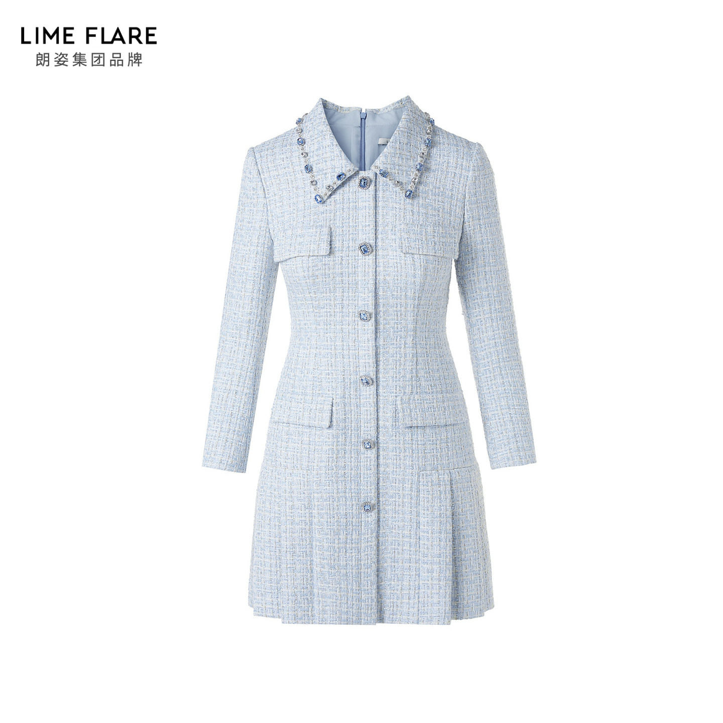朗姿莱茵福莱尔华丽钻扣矜贵复古气质翻领编织花呢连衣裙26春新款