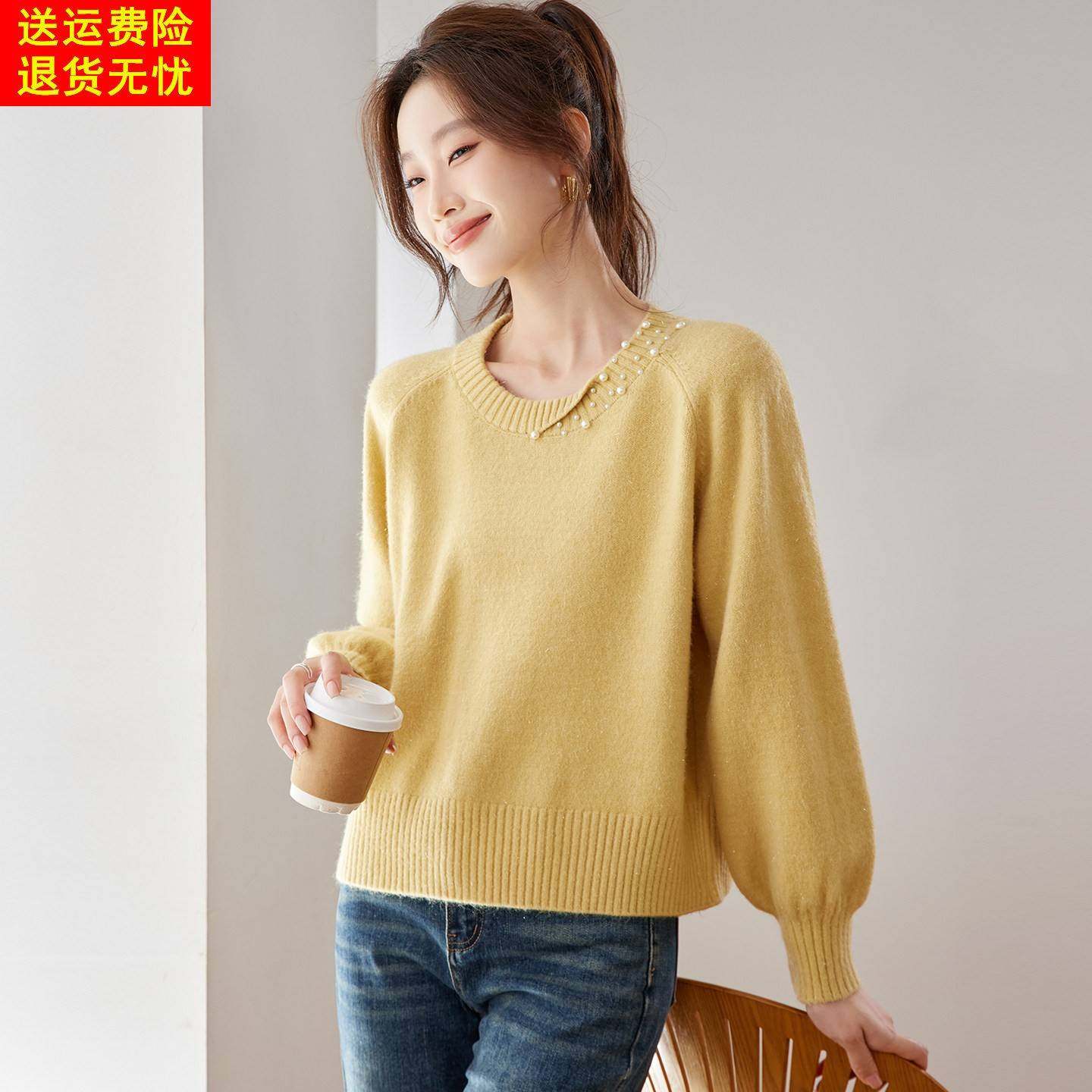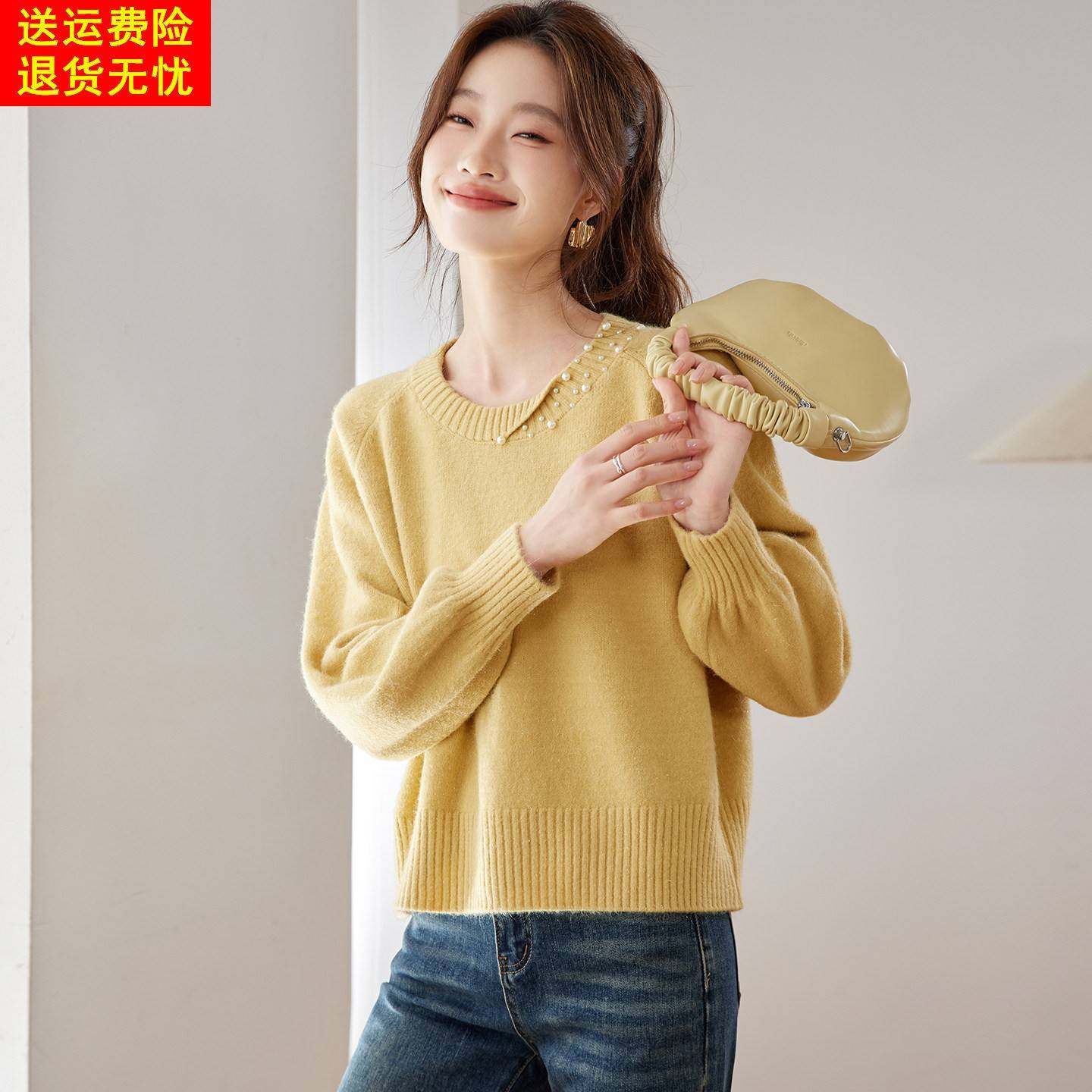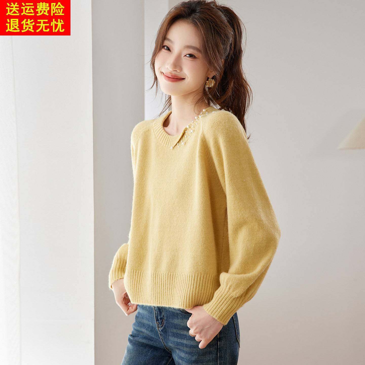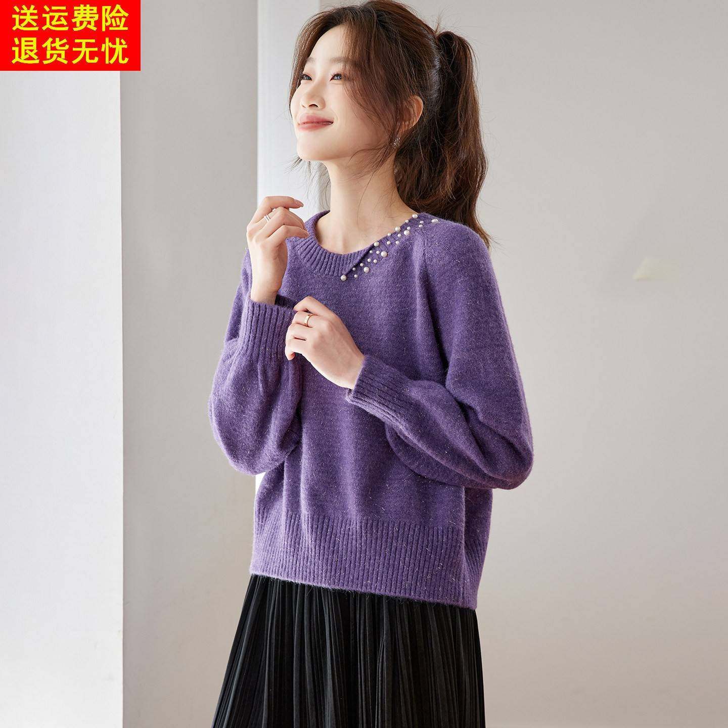 洋气内搭针织打底衫 2025新款 上衣 秋冬季 高级感紫色钉珠毛衣女短款