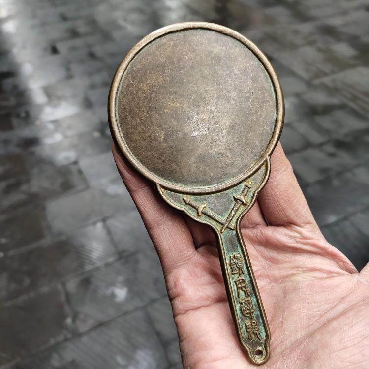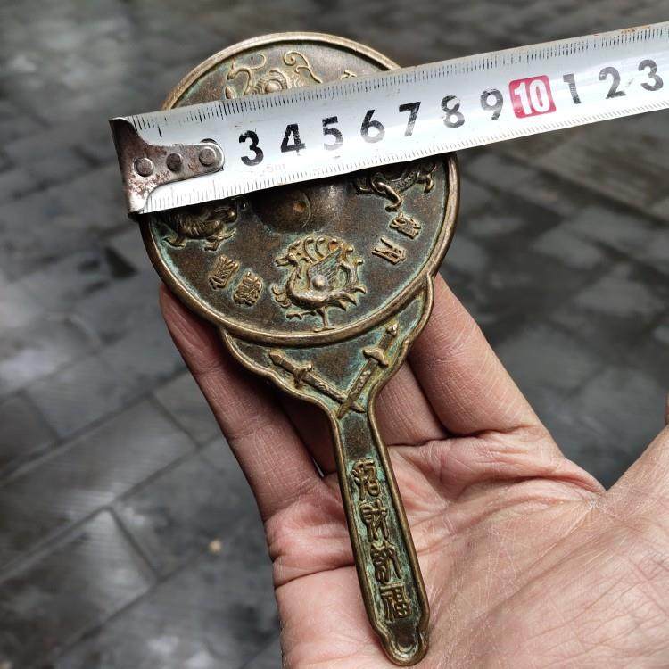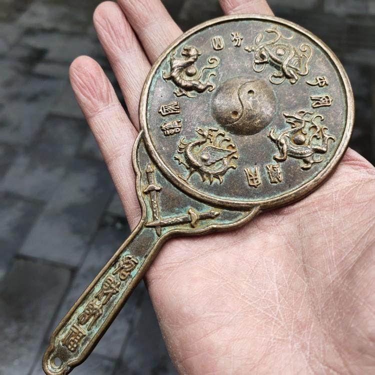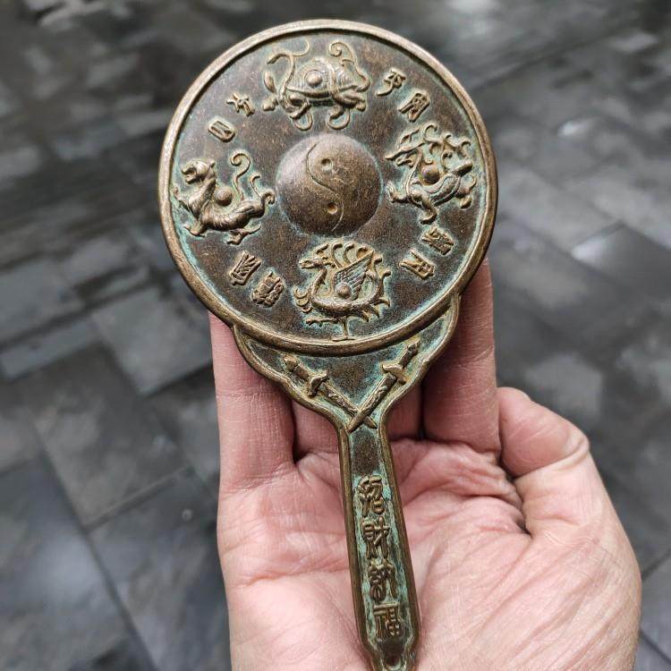 古玩铜器收藏仿古黄铜四兽铜镜手持镜家居工艺品摆件