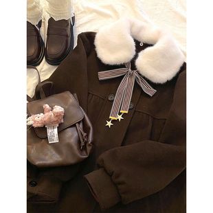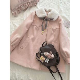 日系学院风vintage设计感娃娃领中长款 新款 毛呢外套 冬季 古早少女