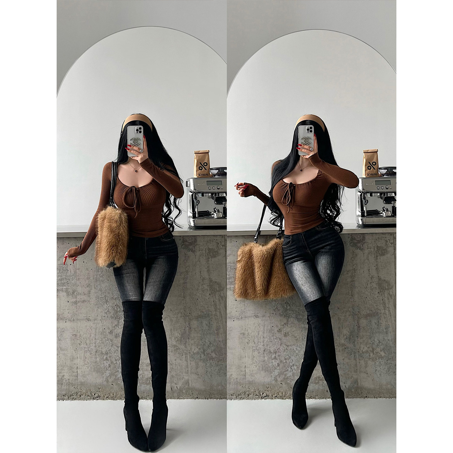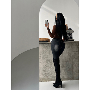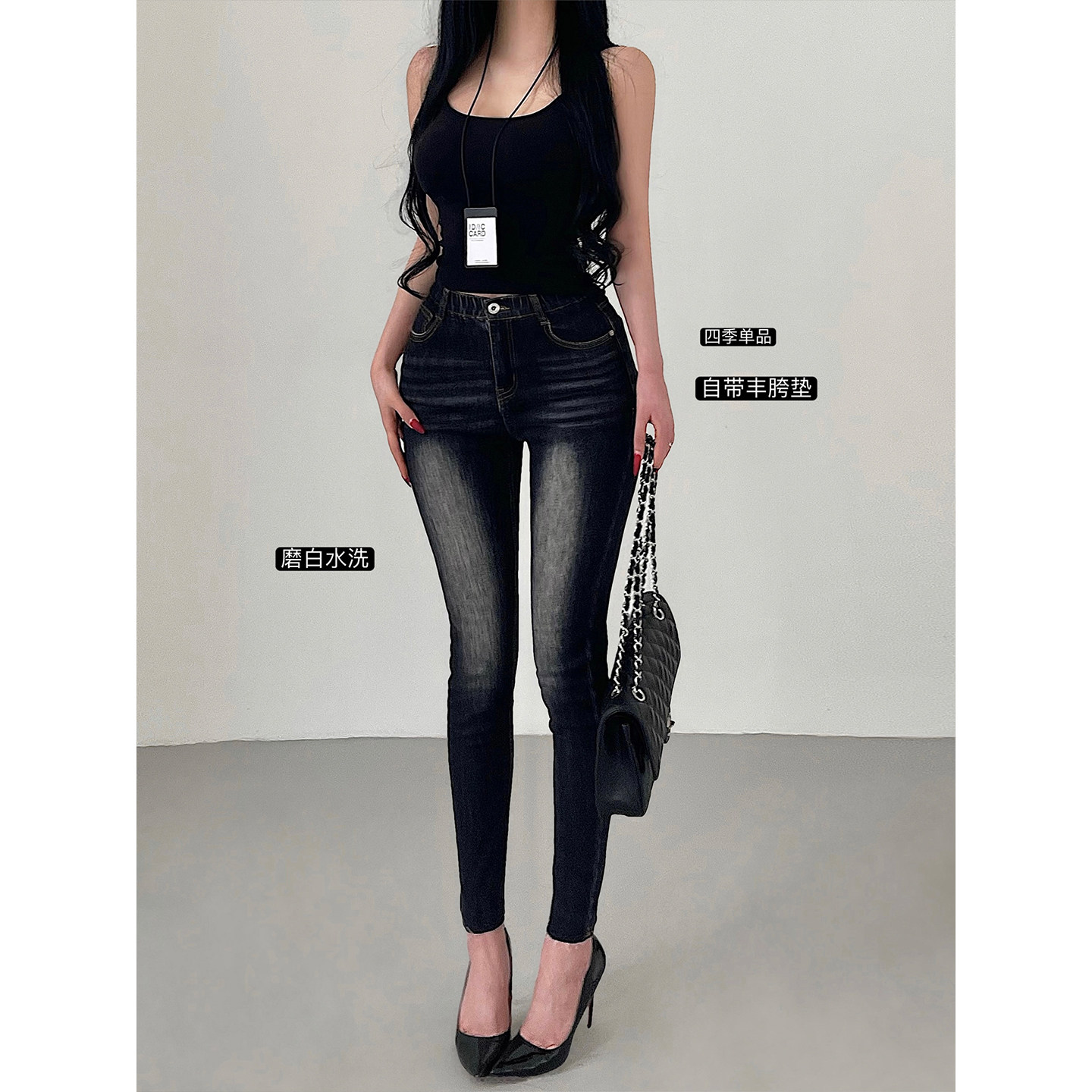 YoungGirlDay韩漫风高腰丰胯显瘦松紧腰小脚紧身铅笔裤 水洗牛仔裤