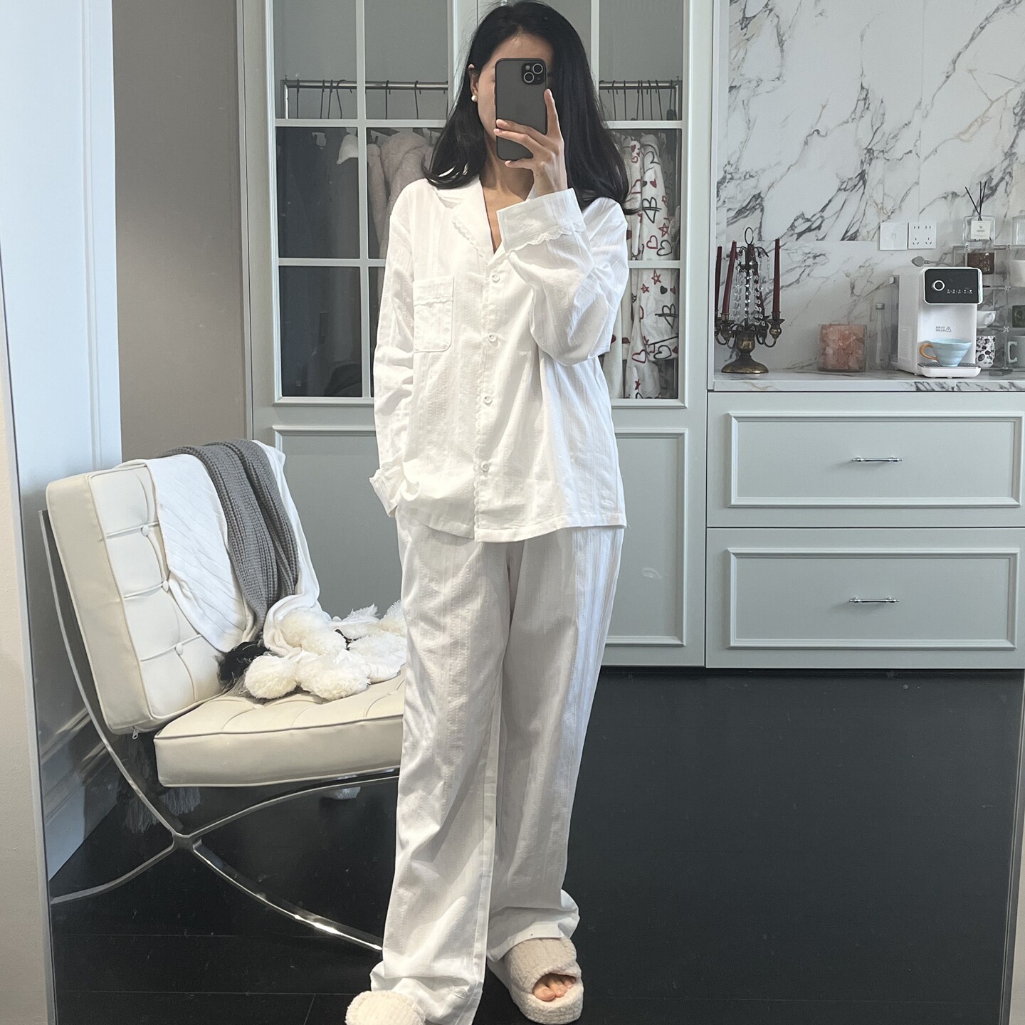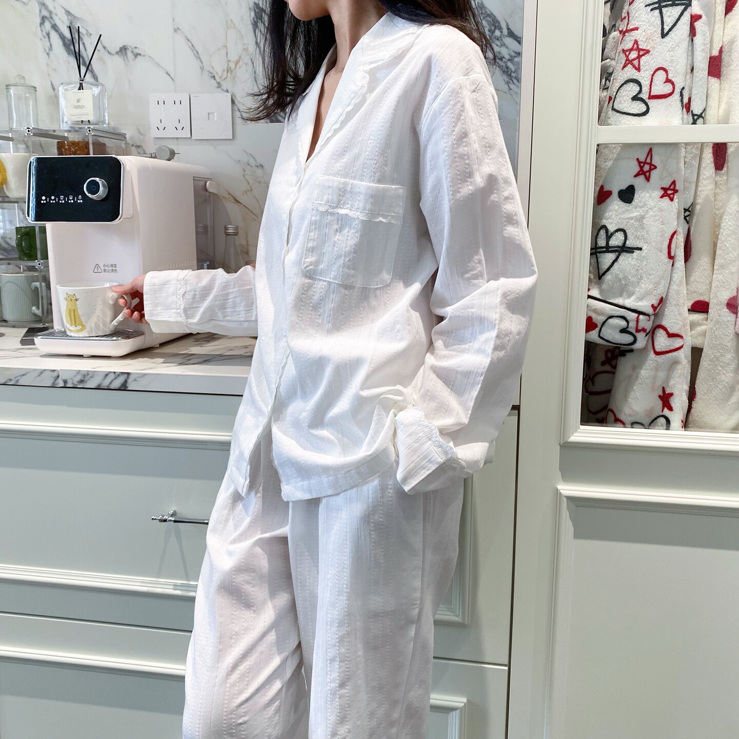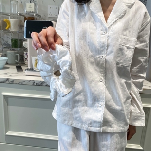 镂空花边衬衫 亲肤条纹提花家居服 领 春季 简约白色棉质睡衣女套装