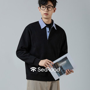 通勤Polo衫 海上公路条纹衬衫 假两件撞色肌理感时尚 秋季 领卫衣男士