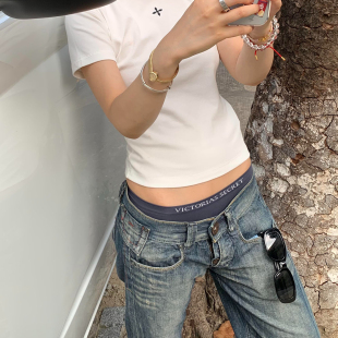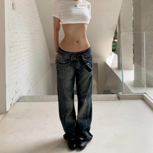 女低腰直筒宽松显瘦垂感休闲裤 街头水洗复古设计感牛仔裤 大码 美式