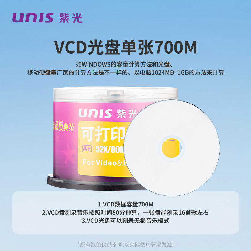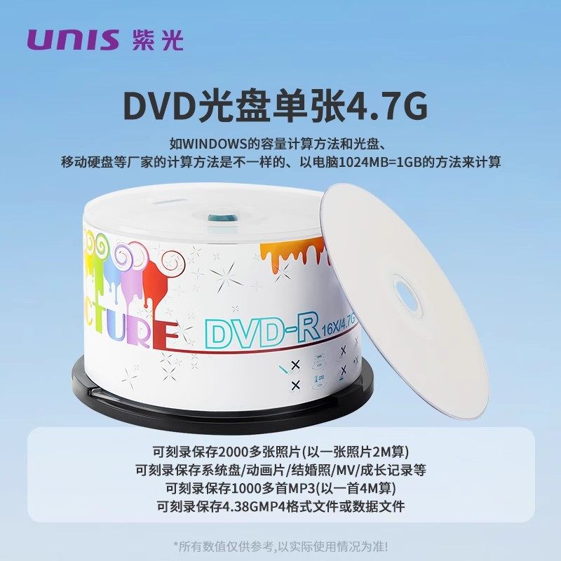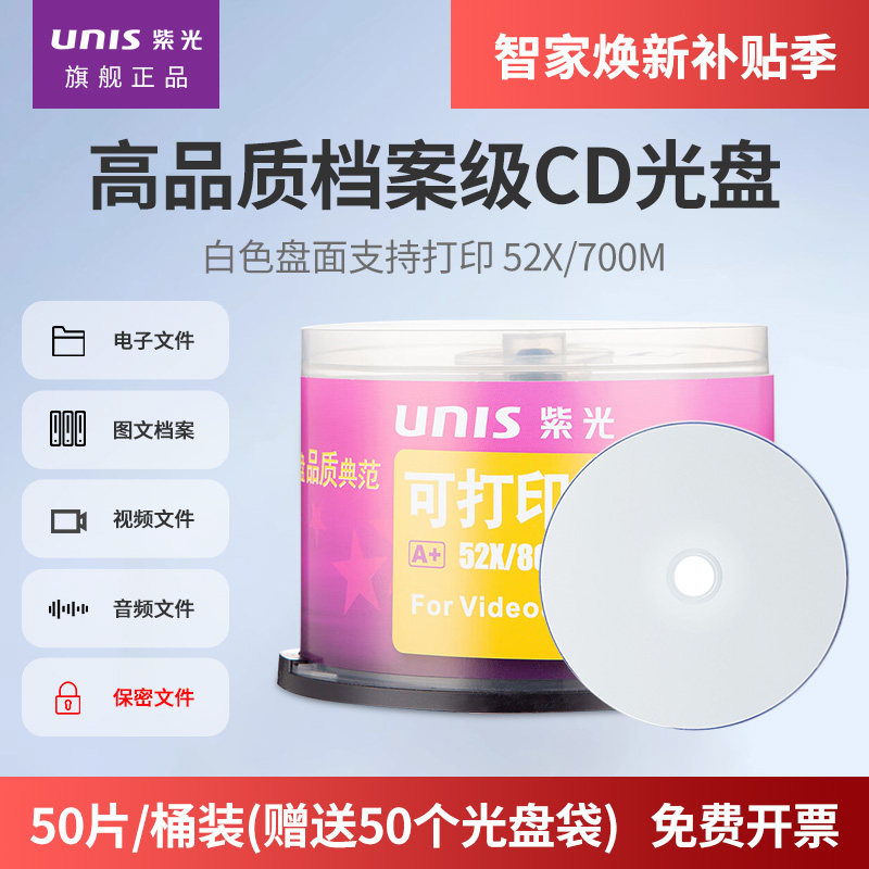 紫光光盘炫彩系列刻录光盘白色盘面可打印dvd空白光盘16速4.7GB桶装 50片档案级大容量刻录cd备份储存光碟
