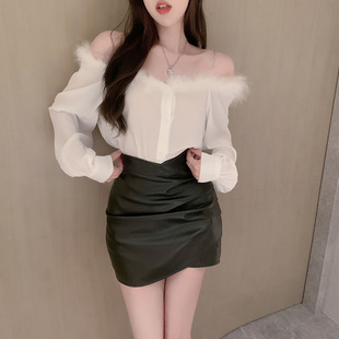 衬衫 设计感小众宽松衬衣短款 女装 薄款 上衣 春季 甜美一字肩毛毛长袖