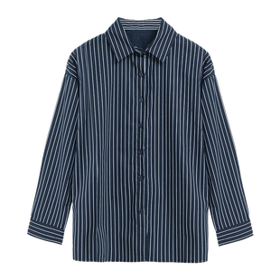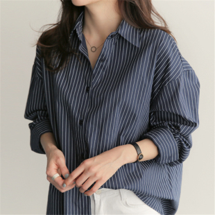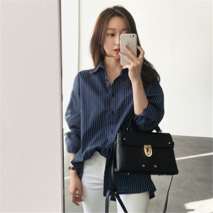 批新款 韩版 发休闲打底大码 宽松衬衣中长款 潮 春季 BF风条纹衬衫 女装