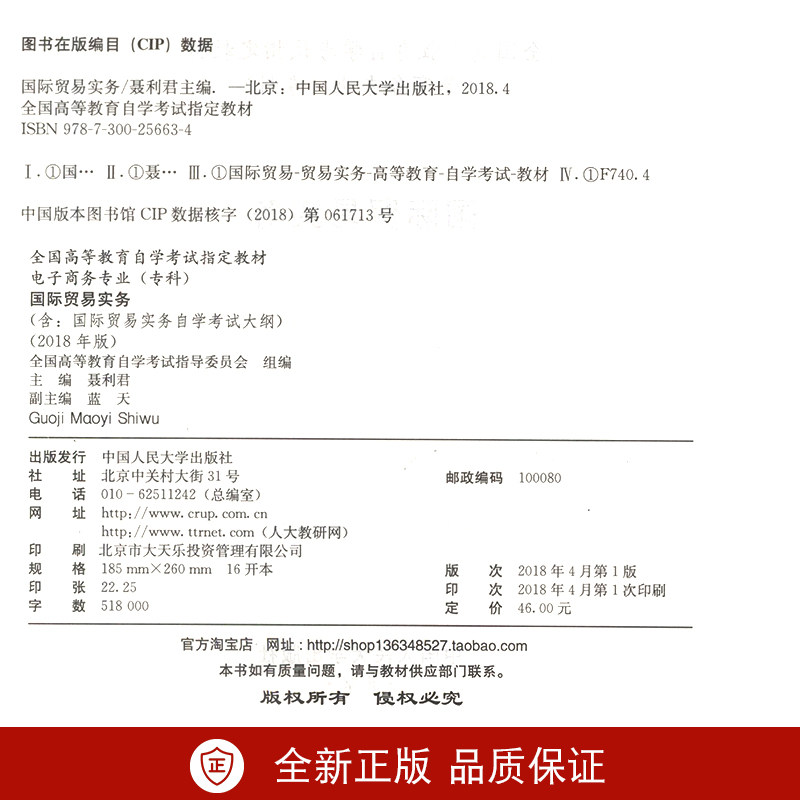 2018年版 全国高等教育自学考试指定教材电子商务专业 考试教材大纲 自考教材 中国人民出版 0891国际贸易实务 聂利君著 社 00891