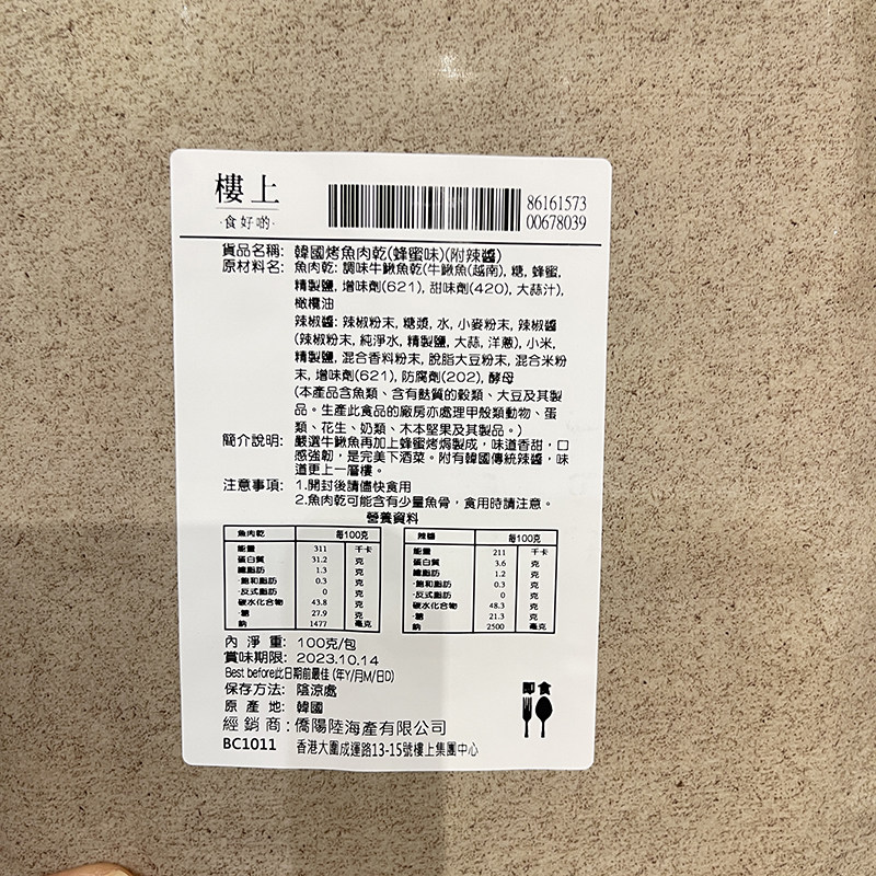 香港楼上韩国烤鱼肉干蜂蜜味附辣酱烤鱼片即食海产海味鱼干零食