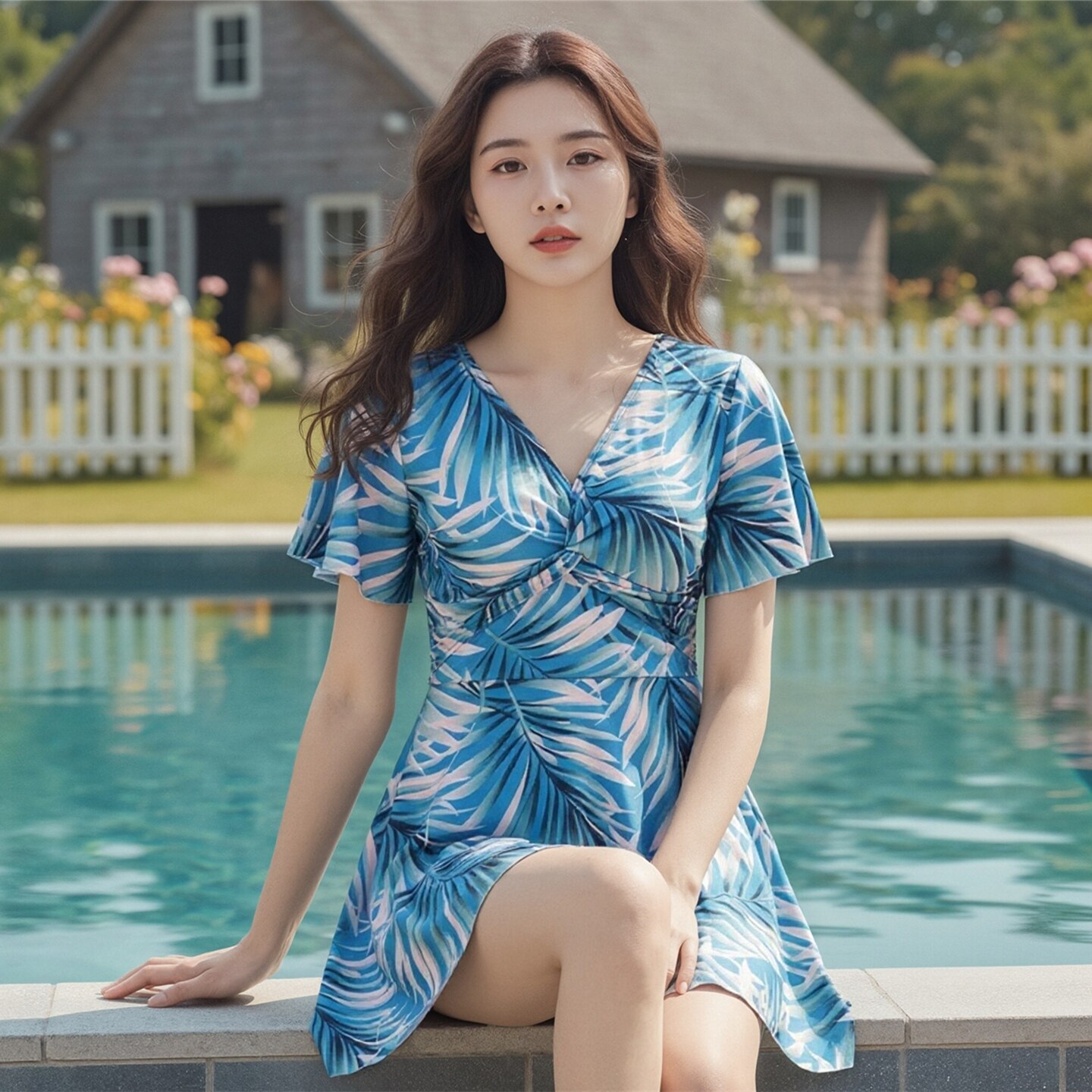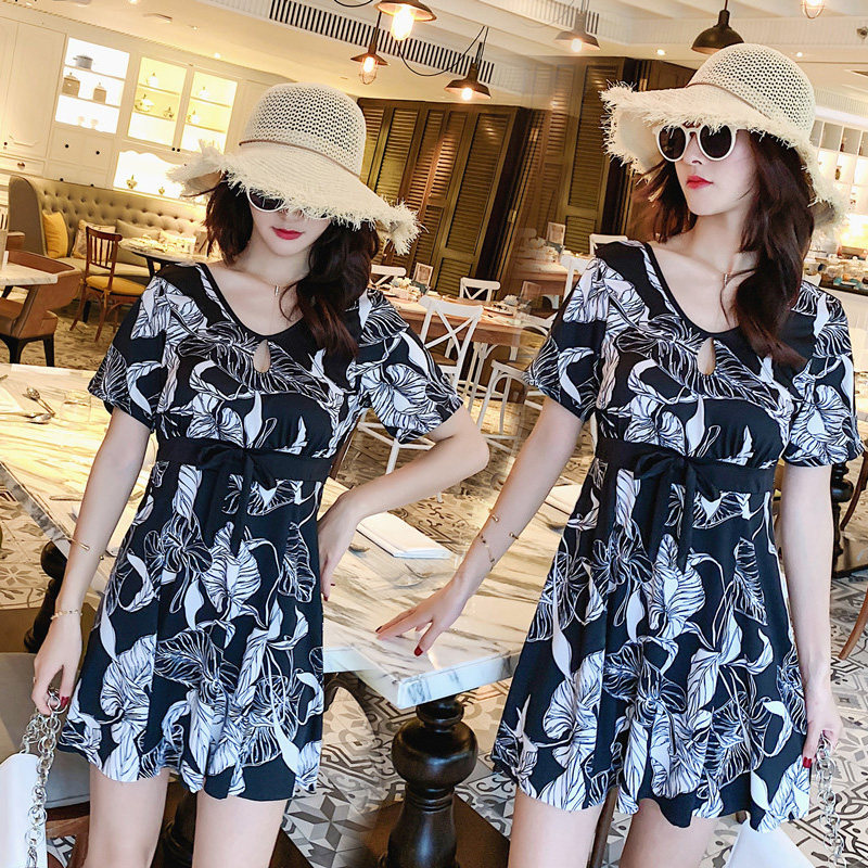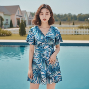 保守印花沙滩泡温泉泳装 平角裤 女士连体泳衣胖MM遮肚显瘦裙式 大码