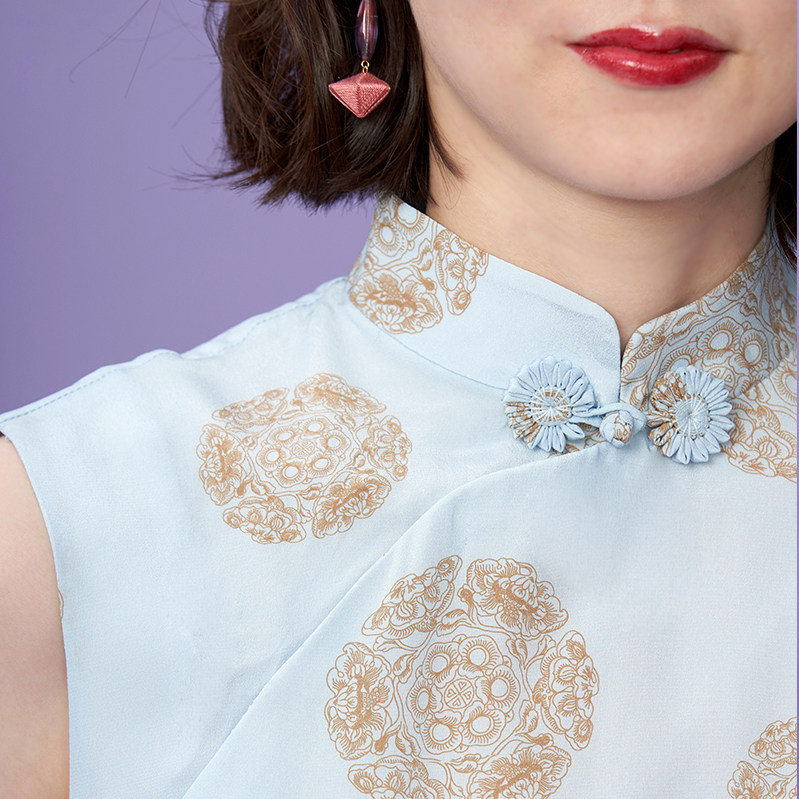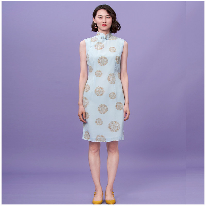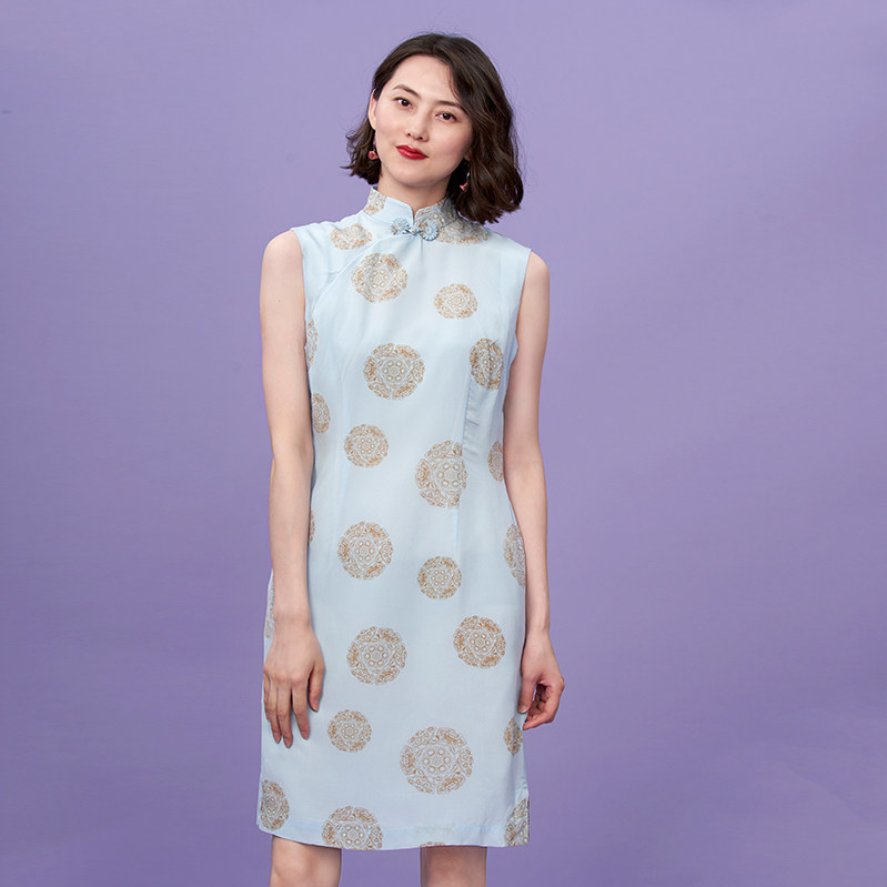 单芒蓝金团花桑蚕丝透气小A字无袖 旗袍裙2020春夏