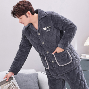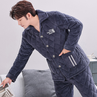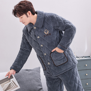 加厚加绒保暖法兰绒家居服套装 睡衣三层夹棉珊瑚绒冬款 男士 秋冬季