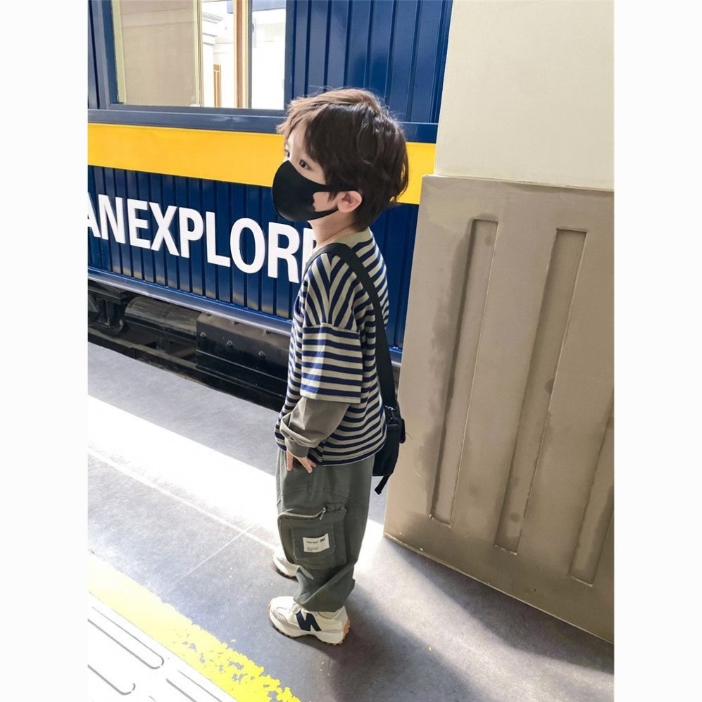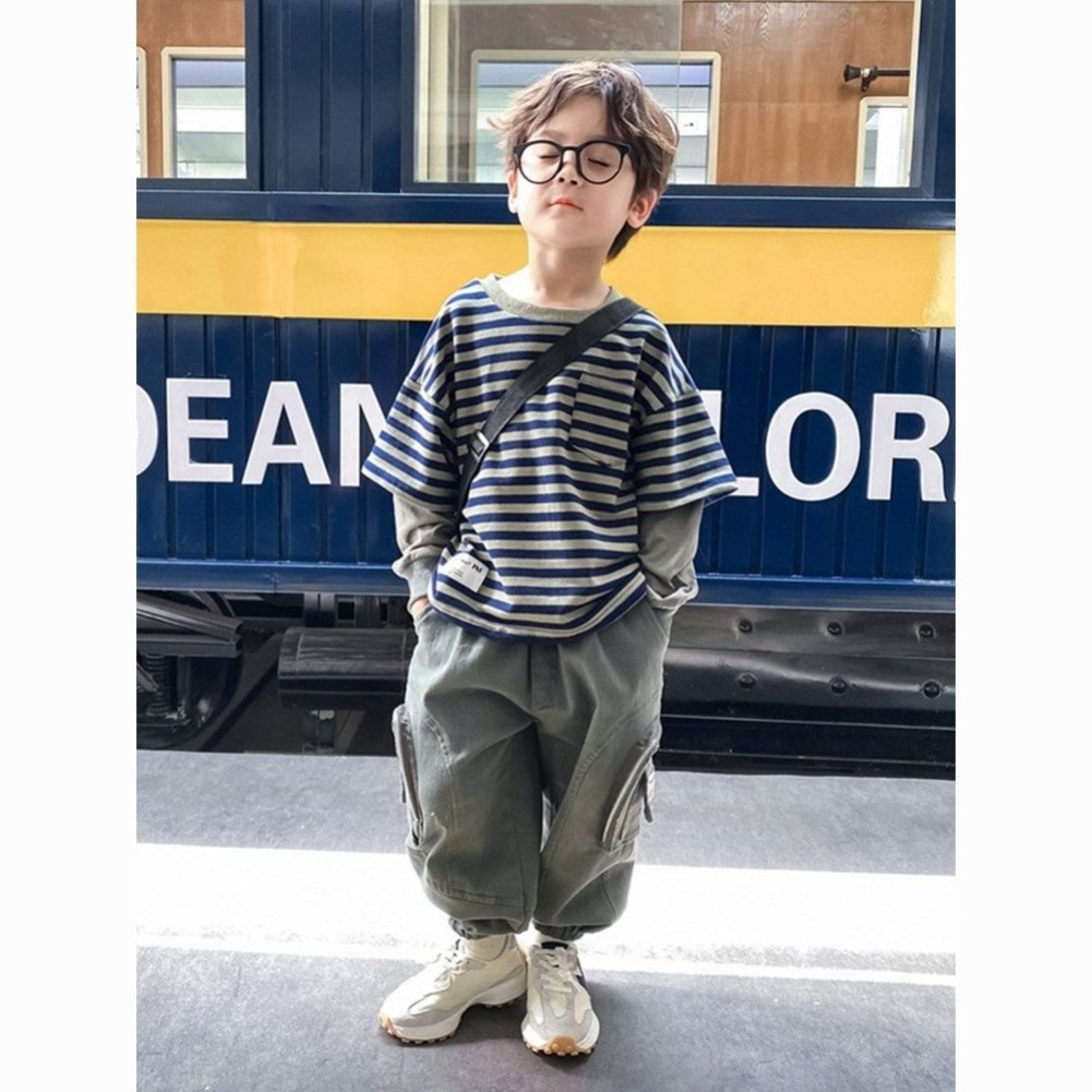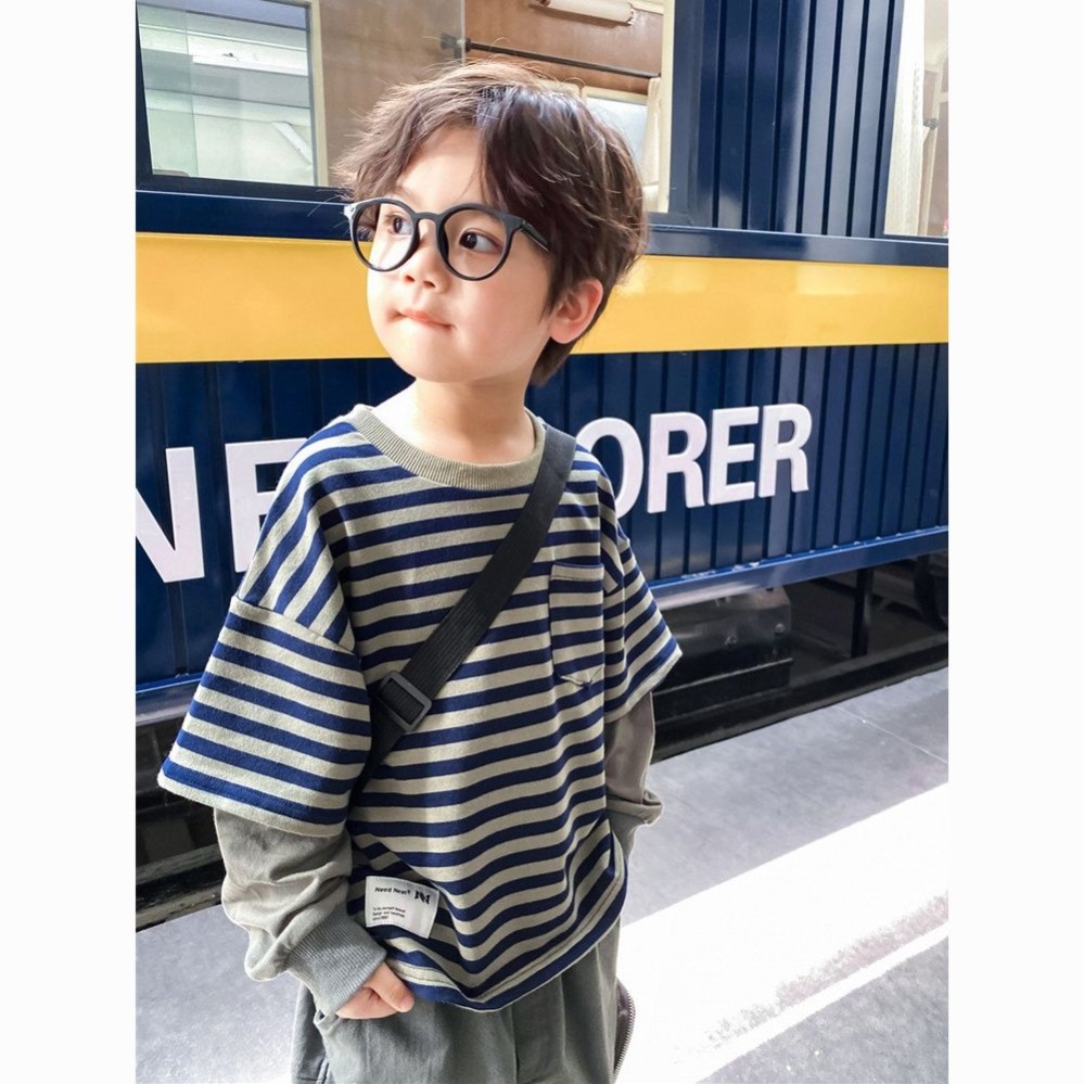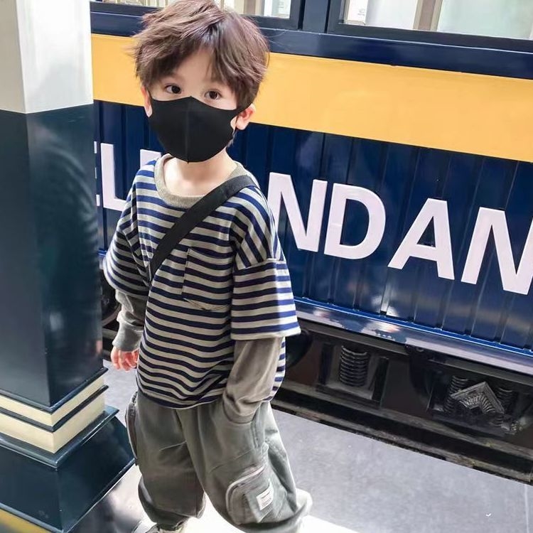 男童卫衣春秋儿童宝宝洋气宽松条纹假两件上衣中大童春装 衣服潮流