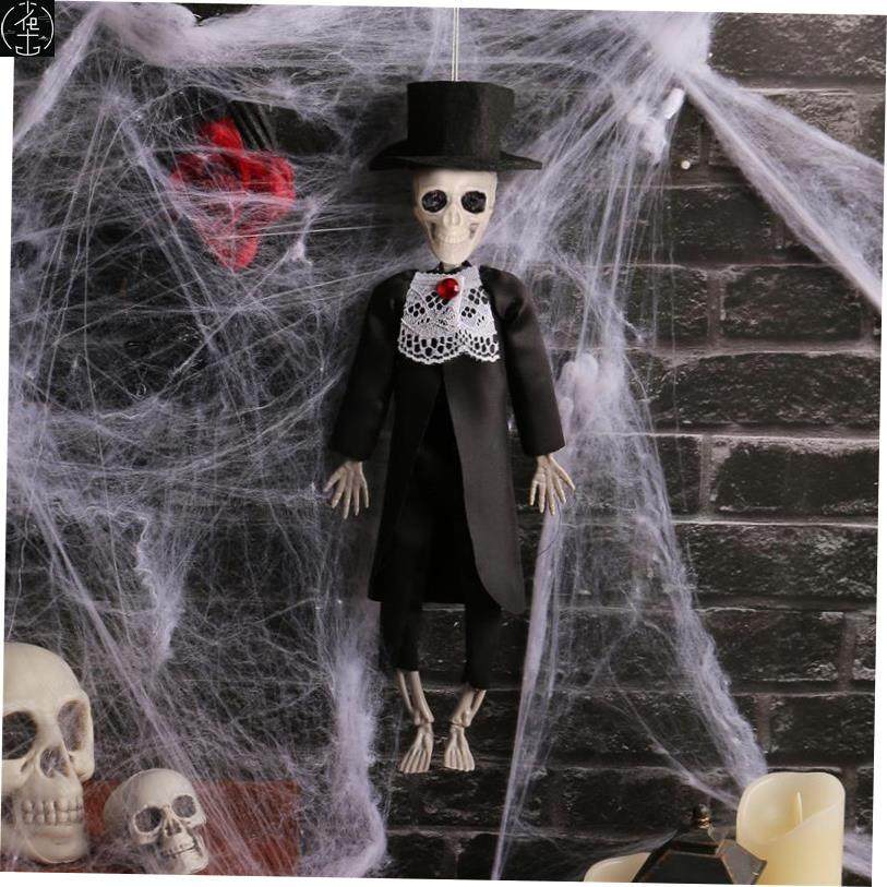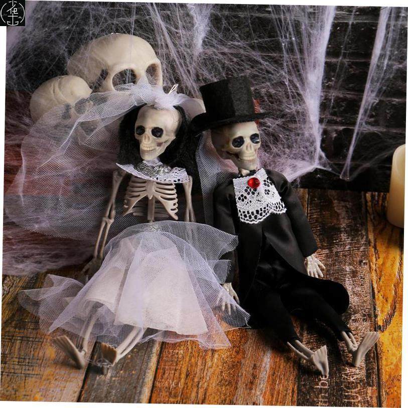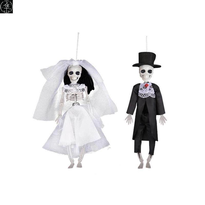 and bride groom hang decorations Halloween party skeleton